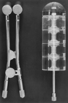 Pelvic radiation therapy technique is extremely important in treatment outcomes, especially in reducing short-term and long-term toxicity.83 Barium should be given at the time of simulation to document the position of the small bowel.84 Attempts to reduce the small bowel in the radiation field include placing the patient in the prone position with a full bladder with or without abdominal compression. Patients should always be treated with a full bladder to move as much of the small bowel as possible out of the pelvic field. The total pelvic radiation therapy dosage is discussed later. Brachytherapy refers to the placement of a radioactive source in or near the desired treatment volume. This allows a higher local radiation dose and spares surrounding normal tissues. The two main forms of delivery of brachytherapy are the LDR and the HDR techniques. The LDR technique uses isotopes that deliver radiation with a dose rate of approximately 40 to 100 cGy/hr to the prescribed target. HDR brachytherapy, which delivers approximately 200 cGy/min, can be performed on an outpatient basis. There is a significant biologic difference between LDR and HDR brachytherapy: HDR delivery has a higher “effective” radiation dose for the same nominal LDR dose. Therefore, the delivered HDR doses must be adjusted lower to give the same effective LDR treatment. The isotopes used in LDR treatment typically include cesium-137 or radium-226. Radium-226 has fallen out of favor because of radiation safety issues. Cesium-137 has a half-life of 30 years, allowing reuse of a source over a long period, although periodic calibration to allow for decay is necessary. HDR treatments typically use an iridium-192 source that needs frequent recalibration and replacement. Iridium-192 can also be used as an LDR isotope. Typically, in most gynecologic applications of brachytherapy, the sources of radiation are left in place temporarily and then removed. This is the case in most LDR applications and all HDR applications. Permanent LDR brachytherapy procedures have a limited use in gynecologic malignancies and are not discussed further. The sources of radiation are, in almost every case, afterloaded into a hollow radiation carrier. This permits some planning before determining the strength of radioactive isotope to use and significantly reduces radiation exposure during placement. The carriers used for afterloading can be divided roughly into those used to treat the intact uterus and those used after surgery. The uterus may be treated with a tandem alone, as is done in treating cervical cancer. Treating the uterus with a tandem alone may underdose the thicker sections of the myometrium. Heyman14 originally described using multiple radium capsules packed into the uterus to stretch and thin the wall to improve the dose distribution. Simon and Silverstone85 later developed afterloading capsules to decrease radiation exposure during placement. Brachytherapy dose is defined either in terms of actual dosage delivered or in terms of total milligram-hours, which is simply derived by multiplying the total milligrams of equivalent radium by the total number of hours of the implant. The doses of radiation used when delivered before surgery with planned hysterectomy typically range from 2500 to 4000 mg-h to the uterus using a tandem or Simon-Heyman capsules and colpostats to deliver 1900 to 2000 mg-h (6000 to 6500 cGy vaginal surface dose) to the upper vagina. In some patients, 50 Gy of postoperative EBRT is added, with the whole-pelvic dosage limited to approximately 2000 cGy by the addition of a midline shield. When definitive radiation is delivered without planned hysterectomy, uterine milligram-hours range from 3000 to 10,000, depending on whether EBRT is also delivered.1–6 Although not commonly reported, the point A dose (i.e., the dose defined as 2 cm superior and 2 cm lateral to the external os) is approximately 7500 to 8500 cGy.1,3 HDR is generally delivered in a fractionated manner, with an attempt to deliver biologically equivalent dose to the traditional LDR implants. Posthysterectomy vaginal brachytherapy is generally delivered with a Delclos vaginal cylinder or with ovoids from a Fletcher-Suit apparatus (Fig. 3). The dose delivered with brachytherapy alone tends to be prescribed at the vaginal surface. Doses range from 6000 to 7000 cGy.37,42,43 I currently prescribe 7000 cGy using cesium-137 with Fletcher-Suit ovoids. The use of postoperative high-dose brachytherapy is becoming more common, allowing outpatient treatment. A common dose schedule is 2100 cGy divided into three fractions of 700 cGy and prescribed to 0.5 cm from the vaginal mucosal surface.41