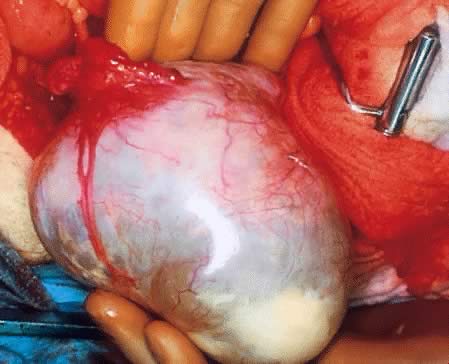 Pseudomyxoma peritonei is a poorly understood and controversial condition characterized by the accumulation of large amounts of mucous material within the peritoneal cavity with involvement of the omentum. This unusual form of neoplasia often is associated with rupture, spillage, leakage, or metastases from a primary appendiceal tumor, a tumor of other areas of the gastrointestinal tract, especially the colon, or from the ovaries. The tumors of the appendix and ovaries can be synchronous, which makes the precise determination of the origin difficult. Most of the time, the pseudomyxoma peritonei is associated with well-differentiated malignant tumors, but it can be secondary to benign mucinous neoplasms. It is argued that the tumors of the ovaries associated with pseudomyxoma peritonei probably are secondary to a tumor in the appendix. In many cases, the ovaries are completely free of tumor; therefore, the primary tumor must have been in the gastrointestinal tract. It also is known that the simple rupture of a mucinous lesion is not sufficient to cause pseudomyxoma peritonei.64,72 Some investigators73–75 suggest metaplasia of the mesothelium as a possible cause of pseudomyxoma peritonei. Therefore, in this case, pseudomyxoma peritonei should be consider as a third site of an independent primary form of neoplasia. This idea is entertained based on the existence of other forms of ovarian type of tumors originating on the peritoneal surface only. On the opposite side of this theory are those that believe that this form of neoplastic process does not occur on the peritoneal surface because mucinous metaplasia of the peritoneum is rare. Also, when a mucinous tumor of the abdomen does not involve the ovary or the appendix, it can develop in the retroperitoneum. Clinically, the fact that mucinous tumors of the ovary associated with pseudomyxoma peritonei are more frequent on the right side suggests an appendiceal origin. By histochemical technique, Ronett and colleagues76 provided evidence that pseudomyxoma peritonei and the mucous cyst present concomitantly in the appendix and ovaries are of appendiceal origin. Other investigators77 using molecular genetic studies failed to demonstrate the association and common origin of the appendiceal and ovarian tumor. It has been suggested that the presence of free mucin in the abdominal cavity should be designated “mucinous ascites.” The presence of mucin with evidence of organization (inflammatory cells, fibroblast, capillaries, and adherence to surfaces) but without neoplastic cells should be designated pseudomyxoma peritonei. The collection of intraabdominal mucus with fibrous adhesions, inflammation, and histologically malignant cells should be designated as mucinous metastatic carcinoma. Pseudomyxoma peritonei is found in approximately 2 of 10,000 laparotomies and is three to four times more common in women than in men.78–80 Most of the patients with pseudomyxoma peritonei have a prolonged clinical course that can lead to progressive bowel dysfunction, intercurrent infection, inanition, and death. In some individuals, pseudomyxoma peritonei does not recur after cytoreduction therapy. Based on two studies,79,80 the most probable origin of pseudomyxoma peritonei is believed to be a benign or malignant tumor of the appendix. These authors based their assumption on anatomic location, careful gross examination of the organs, determination of bilaterality of the ovarian tumors, and meticulous histologic evaluation and comparison of the types of mucus-secreting epithelia. According to Ronnett and coworkers,80 to arrive at the most likely site of origin of the tumor causing pseudomyxoma peritonei, the pathologist should observe the following:
