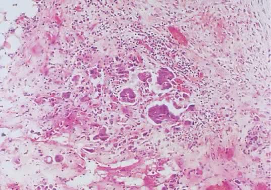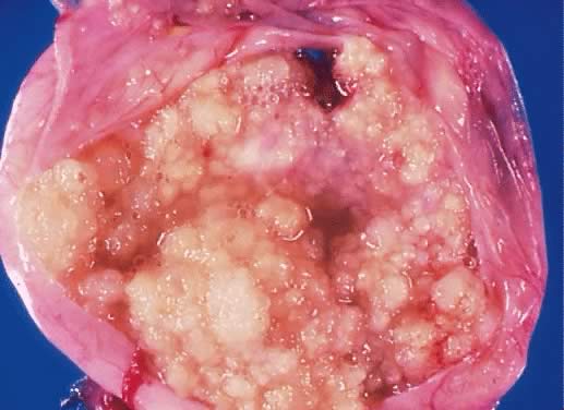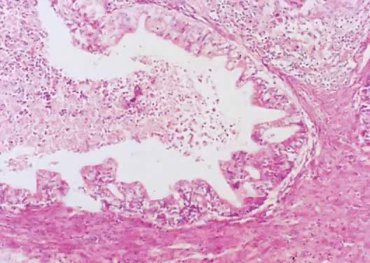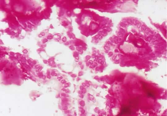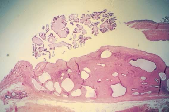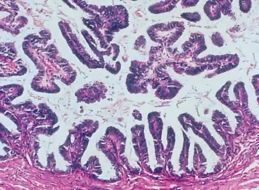 Microscopically, the cell cytoplasm of LMP mucinous tumors is more basophilic than that of the epithelium of the mucinous cystadenoma. Acute and chronic inflammatory infiltrate is found in a few cases. In general, the junction between the atypical epithelium lining the papillary structures of the cyst wall of the tumor with the underlining stroma is sharp and clear. Spread of the tumor outside of the ovary occurs in less than 15% of cases, and when it occurs, it is in the form of pseudomyxoma peritonei. Microinvasion, as defined for LMP serous tumors, is rare in LMP mucinous tumors.63 |