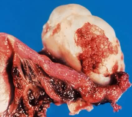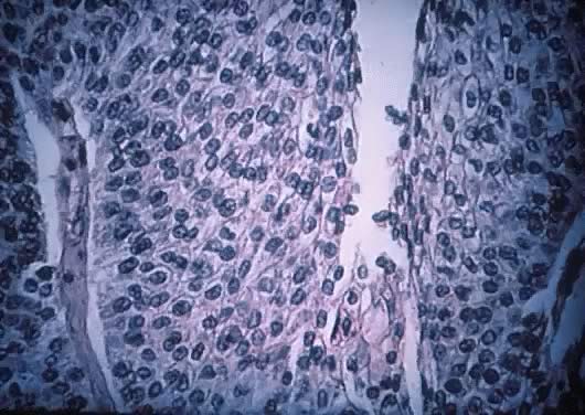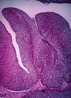 Borderline transitional cell tumor is an unusual neoplasm recognized as originating from mesothelium that has undergone metaplasia, resulting in an urothelium-like epithelium.96,97 This assumption is based on the following: (1) the frequent presence of mucinous or serous epithelium in the tumors and their frequent association with mucinous cysts; (2) the observation of communication or transition between the tumor epithelium and the surface ovarian epithelium that has undergone transitional cell metaplasia; and (3) the close similarities of immunohistochemical reactions and ultrastructural characteristics between the nests of Brenner tumor and the Walthard nests, which are of mesenchymal origin.50 Also, the transitional cell or Brenner tumor may have a germ cell origin. This possible origin has been suggested because of the occasional association of the transitional cell tumor (Brenner tumor) with a dermoid cyst and, more rarely, with the struma ovarii or carcinoid tumor. Transitional cell tumor of LMP, or borderline transitional cell tumor (Brenner tumor of LMP), represents 1.5% to 2.5% of all ovarian neoplasms.17 In our review at Magee-Womens Hospital,8 only one case of transitional cell tumor of LMP (Brenner tumor of LMP) was found (2.6%). The patients range in age from 45 to 80 years. In most series, the average age is about 50 years for transitional cell tumor of LMP or (Brenner tumor of LMP) and 60 for the frankly malignant tumor.98 The tumor size varies from 1 to 40 cm in diameter.13,95,99 In most cases (93%), these tumors are unilateral and occasionally are associated with teratomas (5% to 6%), and in 25% of cases, they coexist with mucinous elements. Two percent of mucinous cystadenomas are known to have a transitional cell or Brenner tumor component.18,58 They usually are well circumscribed, firm, nodular masses that may have a smooth surface. Transitional cell tumor of LMP or Brenner tumors of LMP are predominantly cystic and unilocular (Fig. 25). On cross-section, these tumors show a white-yellow surface and spaces that are totally or partially filled with friable or granular papillae growing from the inner lining of the cyst wall. The cyst lumen contains clear watery fluid. In the 1973, histologic classification of ovarian tumors by the WHO7 criteria for transitional cell tumors of LMP (Brenner cell tumor of LMP) were defined, including cases described by Roth in 197197 and later by Hallgrimson and Scully.100 Roth and collaborators99,101 in 1985 classified the transitional cell tumor (Brenner tumor) into the following categories: metaplastic, proliferating, LMP, and malignant. This classification was based on the comparison of the histologic changes present in the transitional epithelium of the urinary tract with those of the transitional cell tumors of the ovary (Brenner tumors). The classic benign transitional cell tumor (Brenner tumor) exhibits cell morphologic features similar to those in the von Brunn nests. These nests are observed in the inner surface of the urinary bladder, may be single or multiple, and are associated with chronic cystitis.58,95 The metaplastic type of transitional cell tumor, or metaplastic Brenner tumor, is equated with changes seen in cystitis glandularis. Proliferating transitional cell tumor, or proliferating Brenner tumor, is equated with the changes observed in papillary transitional cell carcinoma grade 1 to 2 of the urogenital tract.6,34 No stromal invasion is seen in this type of tumor. The ovarian transitional cell tumor of LMP (Brenner cell tumor of LMP) is compared with the papillary transitional cell carcinoma grade 3 of the urinary tract or with a cervical squamous cell carcinoma in situ of the cervix (Figs. 26 and 27). The well-differentiated malignant transitional cell tumor of the ovary (well-differentiated malignant Brenner tumor) is compared with the invasive transitional cell tumor of the urogenital tract grade 1 to 2. The poorly differentiated transitional cell tumor of the ovary (poorly differentiated malignant Brenner tumor) is compared or equated with the invasive transitional cell tumor of the urogenital tract grade 334,101 (Fig. 28) For some,99 the Brenner tumor forms part of a continuous spectrum characterized by a gradual increase of epithelial abnormalities. None of the tumor subsets (metaplastic proliferating and LMP) have become malignant. Therefore, their behavior and prognosis is similar in the three types. We agree with Fox,21 that it would appear preferable to retain the single diagnostic entity of transitional cell tumor of LMP or Brenner tumor of LMP rather than subdividing it in the three subsets described earlier. The transitional cell tumor of LMP, or Brenner cell tumor of LMP, sometimes is associated with endocrine manifestations of androgenic or, less frequently, estrogenic types, probably secondary to steroid hormone secretion by the tumor stroma.50 The real biologic behavior of these neoplasm is not well known because of their rarity. |
