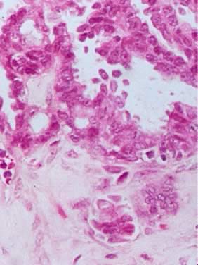 The concept of microinvasion in an LMP tumor of the ovary has been recognized for approximately 30 years.46–49 Histologically, microinvasion is characterized by the presence in the tumor stroma of one or more discrete foci of tumor with LMP features, and the tumor should be formed by cuboidal or columnar cells that appear singly or in groups. These cells have an abundant eosinophilic cytoplasm, round nuclei, and sometimes prominent nucleoli. Occasional hobnail-type cells are identified. The groups of invasive cells are small, and the foci of invasion range from one to eight groups. The cells with eosinophilic cytoplasm can be confused with decidual cells, especially in patients that are pregnant at the time of diagnosis. These types of cells were present in all tumors with microinvasion described by Bell and Scully.49 The eosinophilic cells constitute from less than 10% to more than 90% of the neoplastic cells of the tumors. The cells are single or form nests that must not exceed an area of 10 mm2.50 Occasionally, these nests of tumor cells are associated with psammoma bodies. The groups of cells representing microinvasion generally are surrounded by a clear zone that separates the infiltrating cells from the stroma. This zone or space can be filled with fluid probably secreted by the tumor cells. The invading cells do not involve the ovarian stroma. In some cases, these cells exhibit a cribriform pattern. Typically, there is no stromal reaction to the invading cells; however, when present, it is represented by a slight increase in the number of immature fibroblasts. In the study by Bell and Scully,49 lymphatic invasion was present in 10% of the patients, and all patients were younger than 37 years of age. The definition of microinvasion, as with the definition of implants, varies among authors. The prognosis of the patients with tumors with microinvasion in the series by Katzenstein and associates,46 Tavassoli,48 and Bell and Scully49 was similar to that of the LMP tumors, that is to say, the prognosis was excellent in each of the studies despite the fact that some patients were treated conservatively with limited surgery. Therefore, in cases of young women with LMP tumors with early invasion who are concerned about their fertility, surgery can spare the uterus and the contralateral ovary without significantly increasing the risk. |