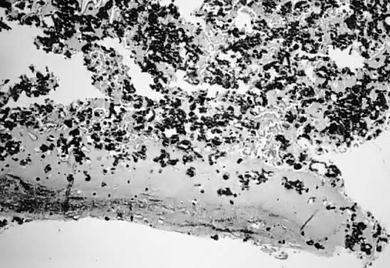 Although the histologic characteristics of psammocarcinoma has been known for years,1,51 only recently has this type of ovarian and peritoneal neoplasm been characterized as a specific entity.52 This tumor previously was considered to be an invasive papillary serous adenocarcinoma of the ovary, most of the time stage III composed of cells with moderate atypia and with psammoma bodies involving at least 75% of the tumor nests or papillae. Psammocarcinoma is considered to be a low-grade serous carcinoma that involves the ovaries, the ovaries and peritoneum, the omentum, mesentery, and gastrocolic ligament. This type of tumor can form large cystic masses accompanied by implants in many intraabdominal or pelvic organs. Psammoma bodies are concentrically laminated calcifications designated as calcospherules. Chemically, they are crystals of hydroxyapatite. They are formed as a result of dystrophic calcification that takes place in epithelial cells and stromal histiocytes that undergo degeneration. These calcific bodies are not specific for psammocarcinoma; they are commonly found in all serous ovarian neoplasias including adenocarcinomas, where they are more abundant than in LMP tumors. Other malignant and benign neoplastic processes, including thyroid carcinomas and meningiomas, may display psammoma bodies.44,52 Several investigators51,53 report on the importance of the presence of psammoma bodies as a prognostic indicator in ovarian carcinoma, but their results have been contradictory. Gilks and colleagues52 report on 11 cases in which the histologic characteristics of the tumor indicated invasive serous carcinomas of the ovaries and peritoneum, whereas their behavior was comparable with that of serous tumors of LMP. Clinically, the patients had the same signs and symptoms as those with full-blown serous adenocarcinoma or serous LMP tumors, including some that were asymptomatic. The patients' mean age was similar to that of patients with serous carcinoma, (i.e., they were older than patients with LMP tumors).52 In some cases, disease may be suspected by the presence of psammoma bodies in the Papanicolaou smear. This event has occurred more than once at our institution. The histologic criteria for the diagnosis are as follows (Figs. 13 to 15):