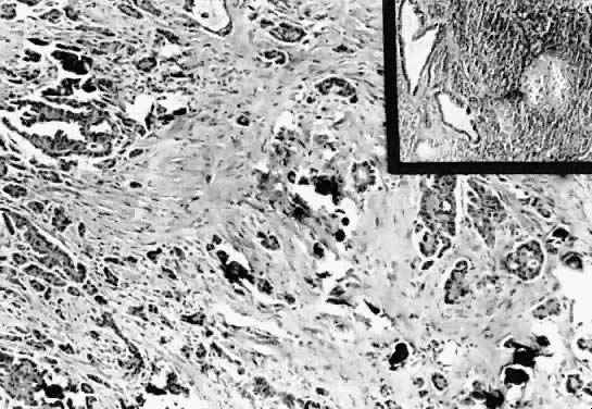 to Gershenson and Silva38, this type of implant should be staged and treated as stage I lesion. Spread of disease to the lymph nodes was not found in any of our cases of LMP tumors reported in the Magee-Women's Hospital series.8 This also is considered a rare occurrence by others.10,17 Rare cases of distant metastases to the brain, lung, bone, and liver have been reported.40 In our series8 of LMP tumors, one patient showed radiologic evidence of metastasis to the liver parenchyma with gross involvement of the liver capsule. In general, the histologic type of the implants remains unchanged with the time. As mentioned earlier, the biologic behavior of the tumors is best predicted by the histologic features of the implants.4,26,36 Michael and Roth35 suggest that the prognosis depends more on the stage of the tumor than on the histologic type of the implants. Gershenson and coworkers41 conclude that the only factor that influenced the time of recurrence, progression, and survival was the presence of macroscopic residual disease at the time of the initial surgery. Evidence in the literature suggests that the presence of implants (especially invasive implants), cellular atypia, and residual gross disease after the initial surgery yield a significantly higher recurrence rate and a lower survival.41 Unfortunately, there is no consensus on the definition of the criteria for the classification of the implants; therefore, there is a lack of correlation among authors in assessing disease persistence, progression, and patient survival. Some authors42–44 divide the implants into “superficially invasive” and “deeply invasive.” Others41 further subdivide the implants into early invasive and frankly invasive. The early invasive implants are defined as those in which only few individual cells are observed in the stroma. Frankly invasive implants are defined as those in which numerous single cells or groups of cells are observe in the stroma. These definitions do not mention stromal necrosis, desmoplasia, or inflammatory infiltrate. The persistence or progression of the tumor and patient survival do not change with either classification. Bell and associates44,45 use criteria for invasion based on the regularity or irregularity of the epithelial clusters invading the subperitoneal tissue, the presence of mitoses, and the nuclear atypia. More studies are needed to standardize the criteria to obtain more reproducible and comparable results. |