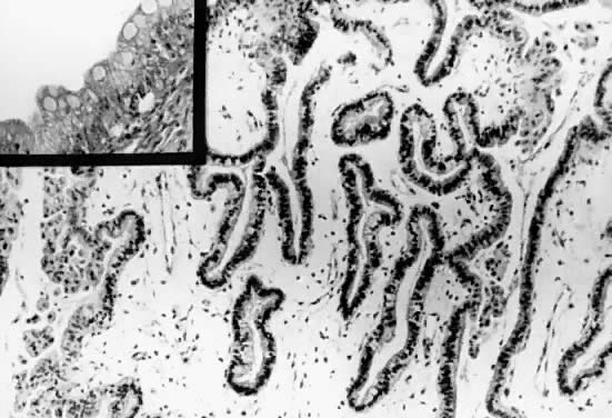 The intestinal or enteric-type mucinous ovarian tumors of LMP constitute more than 85% of the LMP mucinous tumors. Patients with LMP intestinal mucinous tumors are, according to Rutgers and Scully,61 significantly older (45% of their patients were postmenopausal) than those with the müllerian-type tumors (average age, 52 years). Eighty-three percent of the tumors were FIGO9 stage IA at the time of diagnosis, and 17%, stage III. The enteric type of mucinous tumors has a higher staging because of the presence of pseudomyxoma peritonei (discussed later) and lymph node metastasis or inclusions. As mentioned earlier, the average tumor diameter is 19 cm. Seventy-two percent of the tumors are multiloculated; the rest are unilocular (see Fig. 16). Only 23% of the multilocular tumors reported by Rutgers and Scully61 had papillary excrescences in their lumen. Microscopically, all cases of LMP mucinous tumors of intestinal type have goblet cells, Paneth cells, and Grimelius-positive neuroendocrine-type cells19,61,64,65 lining the papillae or cyst walls (Fig. 20). This indicates the presence of intestinal-type epithelium. Other types of epithelia (e.g., squamous, serous, and endometrioid) can be found but should be less than 10% of the total epithelial mass. Some of the papillary structures are long and thin, and others are small with minimal branching. Epithelial bridging in the glands was seen, often rendering a filigree pattern similar to that observed in the malignant tumors. The number of layers of atypical epithelial cells in the mucinous tumors does not exceed three layers (see Fig. 20, inset). Mitoses and tufting are present but not as often as in serous tumors.13 The epithelial-stromal junction is sharp and clear. Complex glandular and cystic patterns resulting from the outpouching of the inner lining of the tumors often are present and created artifacts, resulting in a more difficult assessment of the stromal invasion than with the assessment of LMP serous tumors. Spread of the tumor outside of the ovaries occurs in less than 15% of the cases, and when it occurs, it usually takes the form of pseudomyxoma peritonei (discussed later). True peritoneal or omental implants are rare. Because accurate establishment of stromal invasion, and therefore, the presence of carcinoma often is difficult, Hart and Norris66 suggest different criteria for the diagnosis of LMP mucinous tumors and carcinoma. Neoplasms diagnosed as LMP mucinous tumors not using the stromal invasion criterion and classified as stage I have survival rates of 98% and 96% at 5 and 10 years, respectively. These survival rates also are obtained when stromal invasion is used as the dividing line between LMP tumors and frank malignant neoplasms. Sumithran and associates67 demonstrated that tumors that had more than four layers of epithelial stratification usually followed a malignant course. Their findings support the aforementioned criteria of Hart and Norris.66 Those who use the criteria based on stromal invasion should look for irregular borders between the epithelium and the stroma, irregular gland arrangement, focal chronic inflammatory infiltration, and the presence of a loose immature stroma, or necrosis, or both. Russell13 emphasizes that diagnosing carcinoma without stromal invasion ignores the most important histologic hallmark of malignancy. Colgan and Norris17 determine the existence of invasion by the presence of islets of tumor within connective tissue greater than 2 mm in diameter or more than half-power field. Counting the number of layers present on the papillae or wall of the cyst may be a difficult task for both mucinous and serous tumors in some cases. Therefore, it should be done only on histologic preparations that are clearly perpendicular to the plane of section of the epithelium.34 For more accurate diagnosis, it is ideal to consider as many histologic parameters as possible, including stromal necrosis.15,17,65,68 Nuclear DNA measurement has been used in LMP tumors to identify individual neoplasms with aggressive potential. It is known that aneuploidy is an adverse prognostic factor in ovarian serous carcinomas, independent of clinical stage. Baak and coworkers69 used quantitative microscopic examination to differentiate between LMP mucinous tumors and mucinous carcinomas. The overall agreement between the computer assessment quantitation and light microscopic examination was more than 92%. Unfortunately, this technique is not practical and probably is not cost effective in determining the potential of LMP tumor progression. Some of the reports with meaningful values from both morphometric study and DNA flow cytometric study have problems related to accurate histologic descriptions, tumor staging, lack of description of types of implants (invasive, noninvasive), extent of tumor, sampling, interlaboratory and intralaboratory reproducibility, variations in methodology, and variation in criteria for diploidy and tetraploidy. Therefore, the data available from flow cytometric study of LMP tumors show contradictory results.26,32 When the technique becomes well standardized, flow cytometric study may be of diagnostic value. More studies are needed before a definitive conclusion can be reached. These types of tests, however, can be highly desirable in tumors such as those of LMP, where the separation of these tumors from cystadenocarcinomas with light microscopic examination can be difficult and sometimes impossible. Vimentin can help in the differential diagnosis of serous LMP tumors. In serous carcinoma and endometrioid carcinoma, this immunostain often gives positive results, whereas results are negative in mucinous tumors. The cytoplasm of mucinous carcinomas frequently is positive for carcinoembryonic antigen. Most of the problems of differential diagnosis stem from the possibility that the tumor in question can be a metastatic mucinous adenocarcinoma, especially when the tumor is bilateral and when there is his