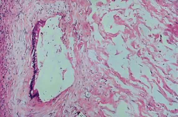 Cystadenofibroma with atypia is known to be formed by tissue of epithelial and mesenchymal origin. The epithelial component usually is serous, but mucinous, clear cell, and endometrioid types may be seen.85 Occasionally, these tumors exhibit atypia but without evidence of stromal invasion. Czernobilsky has suggested the term proliferating adenofibroma for this type of tumor.102 The degree of atypical change is similar to that present in serous ovarian tumors of LMP. Nevertheless, these tumors have a more favorable prognosis than the serous tumors of LMP. This peculiarity may result from the presence of a dense stroma and a thick capsule, which act as a barrier to the progression of the epithelial neoplasm (Figs. 29 and 30), and the lack of papillary structure so typical of the other tumors of LMP, resulting in less surface area for aggressive epithelial growth.93,102 On gross inspection, these tumors are a mixture of solid and cystic areas, but the solid parts outnumber the cystic components (Fig. 31). Occasionally, the cystic parts may be visible only under the microscope. The solid areas exhibit a thick fibrous stroma and are the most characteristic elements of the tumors (see Fig. 31). Sometimes, the epithelial elements are more prominent than the stroma; in this case, this tumors are called adenofibromas. Often, these tumors exhibit squamous metaplasia.103 Most of the cystadenofibromas of LMP are found in the ovary,4,15,26,102 but they also can be present in the fallopian tube and other areas of the pelvis, always in the neighborhood of the ovary.91,102–105 Most cystadenofibromas are serous, but endometrioid or mucinous types occasionally are found.93 Cystadenofibromas represent at least 1% of all ovarian tumors and approximately 46% of all serous tumors.93,106 In general, patients with adenofibromas with atypia are older than those with cystadenofibromas without atypia; however, the tumor occurs at younger ages. |