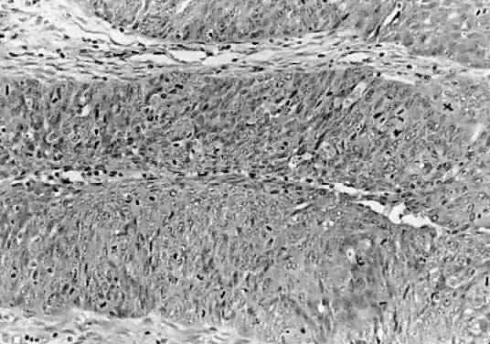 Remember that the tumor classification includes a significant component of subjectivity. The interobserver reproducibility among experienced pathologists averages 56%.12 Russell13 recommends that at least two of the histologic characteristics be present to establish the diagnosis of an LMP tumor. Often, not all histologic characteristics are found. As mentioned earlier, the most important step for an accurate diagnosis is extensive tissue sampling and meticulous microscopic examination. One section for every 1 to 2 cm of the tumor's maximum diameter should be taken. The sections should be obtained from solid and papillary areas as well as from areas of nodular thickening, necrosis, or focal hemorrhage. In the classic report of Taylor,3 patient survival was good, even in patients with tumor implants or metastases. The presence of implants in association with LMP tumors does not necessarily imply malignant metastases. It is not certain whether these implants are real metastases or rather autochronous tumors arising in situ and independent of the primary ovarian neoplasms. The autochronous in situ and independent theory probably is the most likely one. In the series from Magee-Womens Hospital,8 a case in which extraovarian tumor deposits displayed histologic characteristics of a carcinoma was seen, but the neoplasm in the ovary was diagnosed as an LMP tumor. It was not possible to determine whether the malignant-looking extraovarian deposits arose de novo, were implants that became frankly malignant, or were tumor metastasis. |