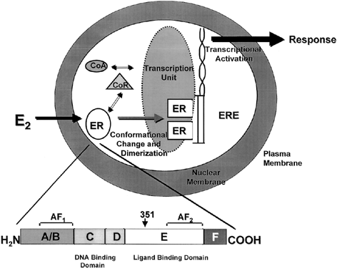 Both ERα and ERβ contain activation functions (AFs) that contribute to the ER's transcriptional activity. AF-1 is located in the amino-terminal region within the A/B region and is believed to be constitutively active and ligand-independent in ERα80,81 (Fig. 1). AF-2 is present at the carboxy-terminus, and is believed to be ligand dependent. Mutational analyses demonstrate the importance of this region for ER transcription because AF-2 can interact with a number of transcriptional coactivators in a ligand-dependent manner.82,83 AF-1 and AF-2 can each activate transcription independently but in most cases they synergize with one another as promoters within the specific cell context. The ER activates gene expression through binding to estrogen response elements (EREs) in responsive genes through the action of AF-1 and AF-2.84 ERβ also activates transcription of target genes through EREs.85 Additionally, estrogen can induce an AP-1 site in a reporter construct through ERα, but it is inactive through ERβ. Interestingly, ER antagonists activate ERβ to induce activity through an AP-1 site.86 These two receptors, ERα and ERβ, form functional heterodimers on DNA and stimulate transcription of a target gene. The existence of two rather than one ER portends a more complex mechanism of action than previously thought and remains a primary therapeutic target for new and existing SERMs.