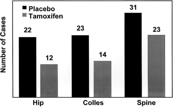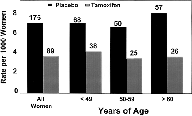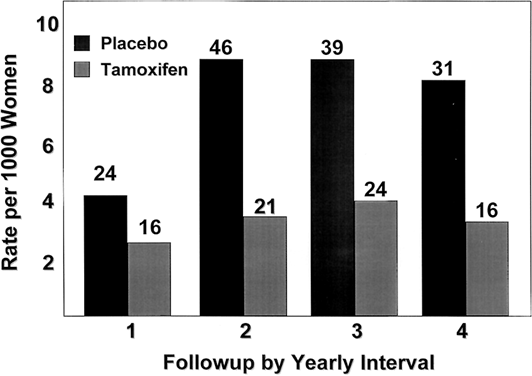 The decrease in contralateral breast cancers following adjuvant therapy and favorable toxicity profile in clinical practice suggested tamoxifen could play a role in breast cancer prevention. Furthermore, estrogenic hormones act over many years to promote a population of initiated cells. Given that the promotional stage is characterized by reversibility, much interest has been shown in preventing the consequences of prolonged, unopposed estrogenic stimulation of the breast. The National Surgical Adjuvant Breast and Bowel Project (NSABP) P-1 opened in the United States and Canada in May 1992 with an accrual goal of 16,000 women from 100 North American sites. The specific aim was to test the utility of tamoxifen as a preventive for breast cancer. It closed after accruing 13,338 women in 1997. Women over the age of 60, or women between the ages of 35 and 59 whose 5-year risk of developing breast cancer, as predicted by the Gail model,145 was equal to that of a 60 year-old woman, were eligible for inclusion. Additionally, women over age 35 with a diagnosis of lobular carcinoma in situ (LCIS) treated by biopsy alone were eligible for entry. In the absence of LCIS, the risk factors necessary to enter the study varied with age, such that a 35-year-old woman needed an RR of 5.07, whereas the required RR for a 45-year-old woman was 1.79. Routine endometrial biopsies were performed in both arms of the study. The breast cancer risk of women enrolled in the study was generally extremely high. Recruitment was also age balanced, with about one third younger than 50 years, one third between 50 and 60 years, and one third older than 60 years. Secondary endpoints of the study include the incidence of fractures and cardiovascular deaths. Most important, the study will provide information regarding tamoxifen's role in the treatment of women who carry somatic mutations in the BRCA-1 gene. Laboratory results are not yet available. The first results of the NSABP study were reported in September 1998, after a mean followup of 47.7 months. In total, 363 invasive and noninvasive breast cancers occurred in the participants; 124 in the tamoxifen group and 239 in the placebo group. A 49% reduction in the risk of invasive breast cancer and a 50% reduction in the risk of noninvasive breast cancer were seen in the tamoxifen arm. A subset analysis of women at risk because of earlier LCIS demonstrated a 56% reduction of risk. The most dramatic risk reduction, 86%, was seen in women at risk due to atypical hyperplasia. The benefits of tamoxifen were observed in all age groups, with an RR of breast cancer ranging from 0.45 in women aged 60 and older to 0.49 for those in the 50- to 59-year-old group, and 0.56 for women aged 49 and younger (Fig. 5). The benefit of tamoxifen was observed in all levels of breast cancer risk within the study and were not confined to a particular lower- or higher-risk subset. As expected, tamoxifen affected the incidence of ER-positive tumors, which were reduced by 69% per year. The rate of ER-negative tumors in the tamoxifen group (1.46 per 1,000 women) did not significantly differ from that of the placebo group (1.20 per 1,000 women) (Fig. 6). Tamoxifen reduced the rate of invasive cancers of all sizes, but the greatest reduction was in the incidence of tumors 2.0 cm or smaller. Tamoxifen also reduced the incidence of both node-positive and node-negative breast cancer. The beneficial effects of tamoxifen were observed for each year of follow-up in the study. After year 1, the risk was reduced by 33%, and in year 5, by 69%. Tamoxifen also reduced the incidence of osteoporotic fractures of the hip, spine, and radius by 19% (Fig. 7),123 approaching, but not reaching statistical significance. This reduction was greatest in women who were 50 years and older at study entry. No differences in the risks of myocardial infarction, angina, coronary artery bypass grafting, or angioplasty were noted between groups.123 The prevention study also confirmed the association between tamoxifen and endometrial carcinoma.125 The relative risk of endometrial cancer in the tamoxifen group was 2.5, with women over age 50 having an RR of 4.01. All endometrial cancers in the tamoxifen group were grade 1 and none of the women receiving tamoxifen died as a result of endometrial cancer. One endometrial cancer death occurred in the placebo group. Although no doubt remains that tamoxifen increases the risk of endometrial cancer, it is important to recognize that this increase translates to an incidence of 2.3 women per 1,000 per year.123 More women in the tamoxifen group developed deep vein thrombosis (DVT),123 with the excess risk confined to women over 50 years. The RR of DVT in the older age group was 1.71 (95% confidence interval [CI], 0.85 to 3.58). An increase in pulmonary emboli was also seen in the older women taking tamoxifen, with an RR of approximately 3. Three deaths from pulmonary emboli occurred in the tamoxifen study arm, all in women with significant comorbidities. An increased incidence of stroke, RR 1.75, was also seen in the tamoxifen group, but this did not reach statistical significance. An assessment of quality of life showed similar depression scores between groups. Hot flashes were reported in 81% of the women taking tamoxifen compared with 69% of the placebo group, and the tamoxifen-associated hot flashes appeared to be of comparable severity. Twenty-nine percent of the women in the tamoxifen group and 13% in the placebo group reported moderate or severe vaginal discharge. No differences in the occurrence of irregular menses, nausea, fluid retention, skin changes, or weight gain or loss were reported. |