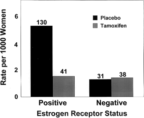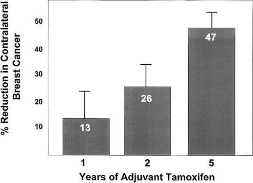 Lerner and coworkers102 described the pharmacologic properties of a low potency nonsteroidal antiestrogen (ethamoxytriphetol (MER 25). In laboratory animals, MER 25 and the related compound MRL 37 demonstrated antifertility actions,103–105 stimulating a search for more potent agents for clinical applications. Clomiphene nafoxidine,106,107 nitromifene,109 and tamoxifen110,111 were all the result of that search, but clinical application as postcoital contraceptives was found to be inappropriate. The drugs stimulate ovulation in subfertile women.112 Clomiphene remains available as a profertility agent, inducing ovulation in subfertile women. In the early 1970s, tamoxifen was tested successfully as an antiestrogen for the treatment of advanced breast cancer in postmenopausal women.113,114 Tamoxifen is now the endocrine therapy of choice for the treatment of all stages of ER-positive breast cancer. A 5-year course is currently considered to be optimal adjuvant therapy and produces a profound increase in disease free and overall survival.115 The 1998 Oxford Overview Analysis115 combined 55 randomized trials that began before 1990, comparing adjuvant tamoxifen therapy to no tamoxifen before recurrence. The study population of 37,000 women with node-positive and node-negative breast cancer, comprised 87% of the known, randomized clinical trials with tamoxifen. Of these women, fewer than 8,000 had a very low or zero level of ER, and 18,000 were classified as ER-positive. The ER status of the remaining nearly 12,000 women was unknown. Based on the normal distribution of ER in random populations, the authors estimated that two thirds would be ER-positive. The recurrence reductions with tamoxifen in ER-positive patients are all significant whereas the therapeutic effect on ER-negative patients is minimal. In 5-year trials of tamoxifen treatment, the reductions of recurrence were 43% and 60% for patients with less than and greater than 100 fmol/mg cytosol of ER protein, respectively, translating to reductions in mortality rates of 23% and 36%. The Overview Analysis also provides unequivocal proof of the laboratory principle that longer tamoxifen adjuvant therapy is more beneficial.116–118 Duration of therapy is extremely important for the ER-positive premenopausal woman with large amounts of circulating estrogen that can rapidly reverse the effect of short-term tamoxifen treatment (Fig. 2). The benefit of 1 year of tamoxifen in the premenopausal woman is virtually nonexistent, with a 20-fold increase in effectiveness with 5 years of therapy. In contrast, the effect of tamoxifen duration on women over the age of 60 is less dramatic because 1 year of tamoxifen is much more effective in postmenopausal women. The principle that longer therapy is more beneficial than shorter therapy is also demonstrated in the control of contralateral breast cancer (Fig. 3). Tamoxifen has no significant effect if 1 year of treatment is used but extending therapy to 5 years produces a 47% reduction in breast cancer incidence. This is a powerful demonstration of the effect of tamoxifen as a chemopreventive. |