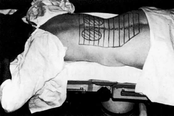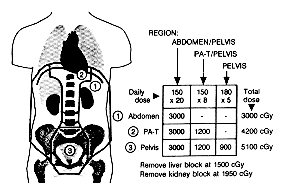 Early in the evaluation of effective treatment strategies for ovarian cancer, it became clear that treatment based on the concept of regionalized therapy was inadequate in inducing long-term remissions. Analysis of data generated from two randomized, clinical trials of adjuvant therapy among patients with early-stage ovarian cancer helps to illuminate these shortcomings.12,13 These trials, one from the Princess Margaret Hospital in Toronto and the other from the Gynecologic Oncology Group (GOG) compared pelvic radiation with observation or single-agent chemotherapy (melphalan). Although limited, the first by lack of surgical staging and the second by patient exclusions (nearly one half of randomized patients), they provided critical information about the “at-risk” tissues in patients with ovarian cancer. Pelvic failures were reduced in those receiving radiotherapy. However, upper abdominal recurrence was a major contributor to overall recurrence, and survival was statistically similar among the three arms evaluated. This suggested that ovarian cancer is responsive to radiation, but to be effective, the treatment field needs to include the entire abdominopelvic cavity. “Moving Strip” versus Open-Field Radiotherapy Two delivery techniques for abdominopelvic radiation therapy (APRT) have been developed and studied prospectively. The first developed was termed the “moving strip” technique. This technique, depicted in Figure 1, was developed in an era in which radiation therapy equipment could not adequately encompass the entire abdomen in a single portal. Therefore, the patient's abdomen was marked with 12 to 14 “strips,” each 2.5 cm in height, and treated for approximately 10 weeks.14 This hypofractionation technique delivered daily fractions of 225 to 300 cGy, accumulating in total abdomen doses of 2250 to 3000 cGy. Although the entire abdominopelvic cavity was treated, criticisms of this technique centered around the prolonged treatment time. Opponents have suggested that this delay could lead to reseeding of metastases and accelerated tumor repopulation. In addition, certain intra-abdominal contents (such as enteric viscera) were assured inhomogeneous treatment doses, given their movement within the treatment fields from day to day. The subsequent development of more sophisticated radiotherapeutic machinery allowed clinicians to the explore “open-field” techniques as an alternative to the moving strip technique. Large treatment fields (up to 45 cm) were devised to encompass all “at-risk” tissues with standard fractionation and dosing schema. Thus, the entire treatment volume could be treated daily. In general, the treatment field extends superiorly to 1 to 3 cm above the diaphragm on full expiration and inferiorly to 2 cm below the obturator foramina. Laterally, the field goes beyond the peritoneal fat stripe. A typical treatment field is outlined in Figure 2. Dose prescribed to the upper abdomen varies by investigator but generally is about 25 Gy. The true pelvis often is boosted to 45 Gy. Several modifications to the open-field technique have been advocated, including methods of shielding vital organs (liver and kidneys), treating the hemiabdomen sequentially, T-shaped boost portals for the para-aortic nodal chains and medial diaphragms, and hyperfractionation schedules.15,16,17,18 An example of one such modification in technique is presented in Figure 3. Stationary and radiosensitive organs such as the kidney, liver, spine, and portions of the gastrointestinal tract are encompassed with both radiation delivery techniques and present technical challenges because these organs often are proximate to the target volume. A review of these tissue tolerances and their associated injuries is listed in Table 1. Custom field blocking and delivery prescriptions must be made so that these tissue tolerances are not exceeded, yet no compromise is made in the target treatment volume. Observed toxicity from radiation therapy is discussed in a subsequent section. TABLE 1. Tolerance Doses (TDs) in Whole Abdominal Radiation Therapy.