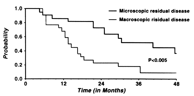 received initial chemotherapy (cisplatin and doxorubicin Toxicity of treatment in this setting is significant and, as discussed subsequently, is related to several factors inherent to patients' identification. Although the presented data are far from conclusive on the topic of consolidation APRT after chemotherapy, patients most likely to benefit are those with microscopic or no residual disease at the time of reassessment. Whether this treatment offers improved survival and quality of life is the focus of ongoing clinical trials, and until this information is known, APRT in this setting should be considered experimental. Salvage Abdominopelvic Radiation Therapy in Epithelial Ovarian Cancer For patients with macroscopic disease found at second-look laparotomy, at reassessment for progressive disease while on therapy, or after a remission, little benefit has been seen for the use of whole abdominal radiation. More than two dozen studies using a variety of techniques have addressed this issue, and disappointing results have been reported. Table 4 presents data from nine trials reporting outcomes of patients with macroscopic residual disease at either second-look laparotomy or reassessment laparotomy.55,56,57,58,59,60,61,62,63 It is easily appreciated from this heterogeneous group of patients that durable progression-free survival is rare. In a recent trial from Rush-Presbyterian-St. Luke's Medical Center, Reddy and colleagues studied the outcome of abdominopelvic radiation in 44 patients failing one (80%) or two (20%) chemotherapy regimens for advanced or recurrent ovarian cancer.64 One half of these patients had macroscopic disease (>1 cm) after a debulking effort. Survival at 48 months was 9% in this group compared with 37% for those with microscopic residual disease (p < 0.005, Fig. 5). Only 5% of those patients with macroscopic residual disease were disease free at 48 months. Disappointingly, progression-free survival at 4 years was no different than overall survival (22% vs. 23%), suggesting that patients rapidly succumbed to their disease shortly after progression. Significant benefit was seen for those patients with pelvic-only residual disease. In patients with pelvic-only disease, 56% were disease free at 48 months compared with 0% for those with upper abdominal disease (p < 0.005). Recurrence after APRT occurred within 24 months in 90% of patients. Review of the patterns of failure demonstrated that upper abdominal control was critical to induction of long-term disease-free survival. In the 31 patients with recurrence after APRT, 28 (90%) had abdominal disease as a component of their failure. Major late toxicity was encountered in nine (21%) patients. In all, 11 complications were seen, including 8 related to bowel injury; five patients required surgical intervention. These authors64 and others have concluded that whole abdominal radiation is unlikely to benefit those patients with macroscopic disease, and only those patients with localized microscopic pelvic disease stand to gain from this treatment. Schray and colleagues performed a multivariate analysis looking at parameters to identify individuals most likely to benefit from APRT therapy in a salvage setting.22 They found prechemotherapy residuum, preradiotherapy residuum, and grade to be predictive of response to APRT. When all three characteristics were favorable, the likelihood of 5-year disease-free survival was 69%; with two favorable characteristics, the likelihood was 53%; with one, the likelihood was 29%; and if no favorable characteristics were present, the likelihood of disease-free survival was 0%. These data, along with that presented previously, supports the contention that if APRT is used, only in the most favorable of subgroups is a benefit seen. However, there are little data to support that these observed responses are any different than those that may be seen with conventional therapy. Among patients with macroscopic disease, there is no proven role for APRT.