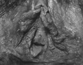 Verrucous carcinoma is a slowly growing tumor, but left untreated, it can be deeply infiltrative and locally destructive. The treatment of verrucous carcinoma is partial deep vulvectomy (wide local excision to the fascia). Lymphadenectomy is not necessary if the lymph nodes are not clinically suspicious. If they are suspicious, lymph node biopsy or fine-needle aspiration is recommended to exclude metastasis rather than lymphadenectomy since metastases to regional lymph nodes are not generally encountered.42 In the majority of cases, lymphadenopathy, if present, is related to an inflammatory reaction evoked by the tumor or secondary to infection. Recurrence is uncommon; however, any new lesions require re-excision. Radiation therapy should be contraindicated because of the possibility that the tumor can undergo anaplastic change with subsequent aggressive behavior after radiation.42 Local application of podophyllin, bleomycin therapy, and cryosurgery are considered ineffective methods of treatment.44 Recently, there has been a report of control of tumor progression using acitretin in a case of verrucous carcinoma not amenable to surgery.45 |