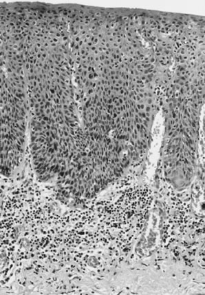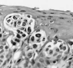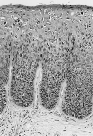 The natural history of VIN is poorly understood; however, VIN is one of the known precursors of vulvar squamous cell carcinoma. The frequency of progression of VIN to invasive squamous cell carcinoma appears to be low, with an estimated frequency from 0% to 18% of reported cases.7,8 In women with invasive squamous cell carcinoma, VIN is frequently found adjacent to the tumor. In deeply invasive tumors, VIN is seen in approximately 25% of the cases; however, in women with superficially invasive squamous carcinoma, the frequency of adjacent VIN approaches 85%. In women presenting with VIN, 2% to 28% have been found to have unsuspected invasive carcinoma with a lesion clinically appearing to be VIN.7 Women with VIN who are elderly, immunocompromised, or who have Fanconi's anemia are at increased risk for invasive disease occurring with a VIN lesion.7 Spontaneous regression of VIN lesions is well recognized, but long-term studies on these patients have not been reported, and the rates of recurrence among these women are unknown. When this disease arises during pregnancy, it may spontaneously regress in the postpartum period and require no therapy.9 These uncertainties should be kept in mind when the prognosis and therapy in any individual case of VIN are considered. Invasive vulvar squamous cell carcinoma has adjacent warty or basaloid type of VIN in approximately 80% of cases. The prognosis in these cases is favorable because the majority of the carcinomas are superficial. In contrast, VIN 3 of the differentiated type is typically found associated with vulvar lichen sclerosus and is associated with well-differentiated squamous cell carcinoma; the mean age of these women is higher than for that of superficially invasive carcinoma (77 years versus 54 years, respectively).10,11 There is a high frequency of cervical or vaginal intraepithelial neoplasia or both (CIN, VAIN) among patients with VIN. In particular, VIN 3 is associated with a high frequency of synchronous or metachronous cervical neoplasia, with HPV infection as a common etiologic factor. Disease in these other areas may precede, coincide with, or occur after the onset of the vulvar lesion. Therefore, patients with VIN must be considered to be in a high-risk category for cervical and vaginal neoplasia and must receive appropriate follow-up, including cervical cytologic studies and colposcopy when the cytologic findings are abnormal. Because of the frequency with which vulvar VIN involves the anal canal and perianal skin, anoscopy is mandatory; sigmoidoscopy and barium enema may be helpful if anoscopy is abnormal. Histopathologic Features Vulvar intraepithelial neoplasia (VIN) is a term that encompasses Bowen's disease, erythroplasia of Queyrat, bowenoid papulosis, and carcinoma simplex. The clinical distinction of these lesions does not reflect biologic behavior. Pathologic distinctions have not been found to be biologically valid. The velvety-red lesions (erythroplastic) of erythroplasia of Queyrat are typically seen in the nonkeratinized squamous mucosa of the vulvar vestibule in a fashion similar to, and share many microscopic and biologic features with, those with white keratotic lesions (bowenoid) or those with hyperpigmented papules or plaques (bowenoid papulosis). These eponymic terms, therefore, have been superseded in favor of the more general term of vulvar intraepithelial neoplasia, which encompasses both clinical and pathologic findings. In normal squamous epithelium, the basal cells divide and thereafter differentiate in a fixed postmitotic fashion. As maturation occurs, cytoplasm is acquired, granules of prekeratin are formed, and the cellular outline and nucleus eventually are lost in the superficial keratin layer. In VIN lesions, the epithelial cells continue to exhibit large nuclei with nuclear hyperchromasia as they progress upward. These cells are atypical. Mitotic figures are found elsewhere than in the basal layer and are often atypical in appearance. Multinucleation implies impairment of the cell division mechanism. Nuclear pleomorphism, hyperchromasia, and loss of maturation are evidence of abnormal development (Figs. 3 and 4). Finally, the rate of epithelial cell division and the number of cells undergoing cell division may be increased, resulting in an increased density of the cell population. The histologic grading of VIN is determined by the degree of maturation loss of the epithelial keratinocytes (see Table 1) as follows1,2: VIN 1: Loss of maturation, with nuclear hyperchromasia and disordered maturation, confined