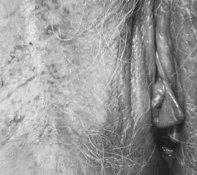 VIN, vulvar intraepithelial neoplasia. VIN can occur at any age starting from puberty. The median frequency appears to be among women in the 4th decade of life; this is far removed from the peak age incidence of invasive squamous carcinoma of the vulva. On clinical examination, VIN lesions may be pink, white, red, or brown and typically are slightly elevated (macular) above the level of the surrounding skin (Fig. 2). White or acetowhite lesions constitute approximately 70% of all cases, pigmented or red lesions being equally divided at approximately 15% each. Approximately 70% of the cases are multifocal, the remainder being unifocal.5 The most common sites of VIN are on the labia minora and the perineum. Perianal involvement occurs in approximately one third of cases of VIN and may extend into the anus. Pruritus is a frequent symptom but is not present in all patients.6