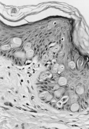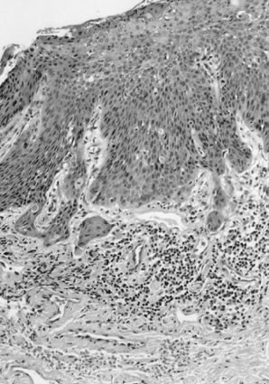 maturation from the basal-parabasal cells (Fig. 3) HPV has been identified by Southern blot, in situ hybridization, and polymerase chain reaction in more than 80% of VIN lesions studied. The variety of HPV types found in preinvasive cervical lesions has not been observed in the vulvar intraepithelial lesions. HPV 16 is the most common type found in the vulva. Most of the warty and basaloid types of VIN and associated squamous carcinomas are HPV 16 related. The differentiated type of VIN is not usually HPV related but is associated with lichen sclerosus (see section on squamous cell carcinoma, microscopic features, below).10 In pigmented VIN lesions, there is a concentration of melanin in the dermal melanophages and basal keratinocytes. The presence or absence of pigmentation does not appear to be associated with clinical behavior but rather location on the vulva, with those VIN lesions involving the skin being more commonly pigmented than those involving the vulvar vestibule. Most lesions show an inflammatory response beneath the disordered epidermis. Treatment Vulvar intraepithelial neoplasia therapy should be administered on an individualized basis. Simple vulvectomy, as has been advocated in the past, constitutes overtreatment. Many patients with this disease are young and sexually active. Every attempt should be made to retain a functioning clitoris and to provide an acceptable functional and cosmetic result. VIN lesions are typically very superficial and confined to the epithelium.12 This permits sparing of the deeper tissues. Lesions confined to the inner vulvar vestibule surfaces can be treated with superficial excision or laser ablation, provided that prior biopsy has excluded invasion. Wide superficial local excision with a 1-cm margin can be performed on localized lesions. Larger lesions can be treated with excision and laser ablation. Histologic evaluation of the specimen is necessary to ensure that there is no invasion and to define the status of the margins of resection. Frozen sections are not necessary and only add to the cost of treatment. With uninvolved margins of resection and absence of occult invasive foci within the lesion itself, the prognosis for patients treated in this manner is extremely good. Should new foci of disease occur, they can be handled in a similar fashion. The rate of local recurrence is approximately 6% for negative margins and approximately 20% for involved margins.6 Therefore, re-excision with involved margins is not always necessary; a follow-up examination determines whether VIN is present and further treatment necessary. Extensive confluent multicentric lesions involving the entire vulva demand a careful treatment plan. Multicentric VIN lesions can be treated with superficial excision alone or with a combination of superficial excision and laser ablation.13 It is recognized that skin appendage involvement by VIN occurs and, in hair-bearing skin, may involve skin appendages to a depth of up to 2.9 mm. In nonhair-bearing skin (e.g., vulvar vestibule, labia minora, clitoris, perineal body), skin appendage involvement is not an issue, and in these areas, the VIN is typically less than 1-mm thick.12} Consequently, a plan of therapy should use a local superficial excision of the VIN lesions involving the hair-bearing skin and the skin with sebaceous glands without hair (e.g., medial labia majora, perianal and perineal areas peripheral to Hart's line).13 Superficial excision “skinning” procedures are one approach for such cases. As a rule, the surgical wound edges can be approximated primarily by mobilization of vaginal epithelium and creation of full-thickness flaps of adjacent skin. Some surgeons prefer the primary grafting of the denuded area with skin removed from a thigh donor site. Treatment with laser ablation or superficial excision of the VIN involving the clitoris, vestibule, labia minora, and perineal body proximal to Hart's line (i.e., the junction between the nonkeratinized epithelium of the vestibule and the skin) is an effective approach. In these nonhairbearing areas, it is essential that careful evaluation and selective biopsy of the VIN lesions be performed to exclude associated invasive carcinoma before treatment is initiated.7,14 Topical 5-fluorouracil has been advocated in the past for the treatment of VIN. Therapy consists of topical application of a 5% 5-fluorouracil cream applied three times per week for a period of 6 weeks. This therapy is not currently recommended in women of reproductive age because of changes in the U.S. Food and Drug Administration' s position regarding this medication and its potential side effects in pregnancy. Either technique gives a good cosmetic result and extremely low recurrence rate, provided the initial procedure is carried down to a level well below the epidermis and its adnexa and beyond the visible margins of disease. The clitoris usually can be spared, thus retaining the possibility of function. Irradiation and radical surgical excision have no place in the treatment of VIN. Some studies have shown promising results using photodynamic therapy (PDT), particularly 5-aminolevulinic acid (5-ALA), as a nonsurgical approach to the treatment of VIN.15 In one study of 25 patients16 using topical sensitization of VIN lesions with 5-ALA and subsequent PDT, all VIN 1 lesions showed responsiveness, as did all monofocal and bifocal VIN lesions regardless of grade. However, multifocal VIN 3 disease did not respond well to the treatment. Use of topical Imiquimod, an immune response modifier, for VIN 3 lesions has also shown some promising preliminary results.17 |