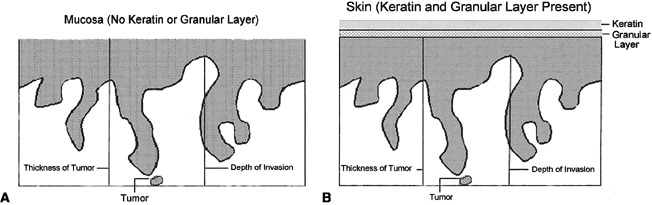 AJCC, American Joint Comission on Cancer. FIGO, International Federation of Gynecology and Obstetrics. The prognosis for vulvar carcinoma is primarily related to the size of the original lesion and the presence or absence of nodal metastases. Patients with tumors confined to the vulva with tumor-free groin nodes have a corrected 5-year survival rate of 90% after adequate excision of the tumor and usual ipsilateral inguinal-femoral lymphadenectomy. If the tumor has spread to the groin nodes, the corrected 5-year survival rate decreases to 65%. If the tumor has spread to involve the pelvic nodes as well, the survival rate is less than 25%.14,25,28 Large squamous carcinomas of the vulva have been reported in association with hypercalcemia, without bone metastasis.29 This is primarily mediated through the production of parathyroid hormone from the neoplastic keratinocytes.2,29 In addition, attempts at medical correction of the hypercalcemia have been unsuccessful. After excision of the tumor, the serum calcium level returns to normal but rises again with recurrent disease. Superficially Invasive Carcinoma of the Vulva The concept of superficially invasive carcinoma of the vulva implies that lesions with limited dermal invasion may constitute a separate prognostic category.28,30 The term microinvasive carcinoma has not been accepted for reference to vulvar carcinoma. Solitary tumors with a depth of invasion of 1 mm or less have essentially no risk of regional node metastasis, and node sampling or resection is not contributory in these. HISTOPATHOLOGY The FIGO staging of vulvar carcinoma has defined a stage IA subset of stage I carcinoma as originally set forth by the ISSVD, as a tumor with a diameter of 2 cm (20 mm) or less with a depth of invasion of 1 mm or less (Fig. 8). Measurement of tumor diameter alone is insufficient to define the risk of nodal metastasis. Most vulvar carcinomas with a depth of invasion of 1 mm or less are less than 2 cm in diameter. Clinically, VIN surrounding the tumor may be included erroneously in the measurement of the tumor diameter. In superficially invasive vulvar carcinoma, it is essential that the entire tumor be available for study before an attempt is made to determine the depth of invasion. Cases in which there is more than one tumor are not included in the stage IA group. The depth of invasion is defined as the measurement from the epithelial-stromal junction of the adjacent most superficial dermal papilla to the deepest point of invasion, as described by Wilkinson and colleagues.1,30,31 The ISGP and the WHO have accepted this definition of the “depth of invasion” in the vulva.1,2 This measurement should be distinguished from the “thickness of the tumor,” which is defined as the measurement from the surface, or bottom of the granular layer of keratin, if present, to the deepest point of invasion (Fig. 9A, B). The ISGP and WHO recommend that the pathologist report both measurements whenever possible. The stage IA group includes patients whose tumors involve capillary-like spaces, provided skin measurements are available. A protocol for the evaluation of vulvar specimens drafted by the senior author (Wilkinson) has been published by the College of American Pathologists.26