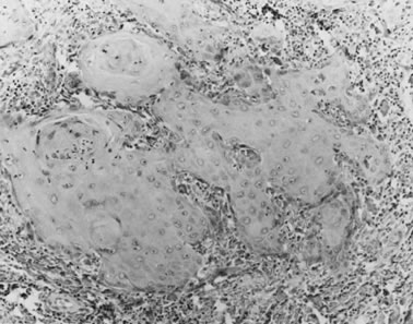 CLINICAL FOLLOW-UP Superficially invasive vulvar squamous cell carcinomas that meet the definition of stage IA have essentially no risk of nodal metastases. In contrast, with tumors 3-mm deep, the risk of nodal metastasis is approximately 12%. With a 5-mm depth of invasion, or thickness, there is a reported risk of nodal metastases of approximately 15%.1,25 Follow-up of women with vulvar superficially invasive carcinoma is essential because it is recognized that these women, although they have a relatively low risk of local recurrence, are at risk of having a “reoccurrence” of a new primary tumor or the vulva, independent of the original tumor site. Although this risk is low, awareness and observation, with biopsy when indicated, can reduce the risk of metastases or death from a recurrent or new “reoccurrent” vulvar carcinoma.25,31 Frankly Invasive Squamous Cell Carcinoma of the Vulva Frankly invasive squamous cell carcinomas include all of those that invade to a depth beyond the limit used to define superficially invasive carcinoma (1 mm). HISTOPATHOLOGY Histologic subtypes of squamous cell carcinomas are listed in Table 8. Squamous cell carcinomas with keratin pearls and obvious squamous cellular characteristics are considered well differentiated (Fig. 10). This pattern is usually the most frequent histologic type encountered. Other terms that have been suggested for the keratin pearl-forming carcinomas include large cell keratinizing, keratinizing, and epidermoid carcinoma. These tumors are more common in older women and are usually not associated with HPV.1,10 The less well-differentiated squamous cell carcinomas are less obviously squamous in origin without prominent intercellular bridges or keratinization (Fig. 11). Table 8. Histologic Subtypes of Vulvar Squamous Cell Carcinoma Including