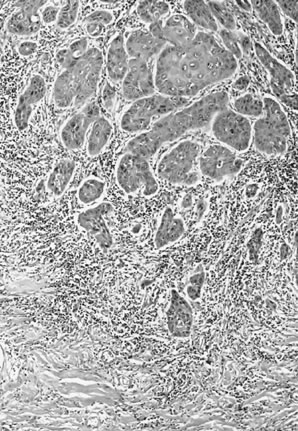 Verrucous carcinomas are an uncommon, special type of tumor with characteristic gross and microscopic features.42 Clinically, they are slow-growing, papillary, cauliflower-like lesions that eventually may become necrotic, ulcerated, and fungating.1,42 They may be locally destructive, and when surgically excised, they commonly recur but rarely metastasize. On histologic examination, verrucous carcinomas show a wartlike character similar to condylomata acuminata, demonstrating numerous branching papillary stalks composed of extremely well-differentiated squamous epithelium. Verrucous carcinomas are characterized by a “pushing” border with a well-defined tumor-dermal interface, without apparent infiltration.42 Cellular atypia is minimal and always restricted to the basal layer.42 Atypical mitotic figures are not identified and dyskeratosis and koilocytosis are absent. A chronic inflammatory cell infiltrate within the dermis is usually present. The lesion, called “giant condyloma of Buschke Lowenstein,” is now considered verrucous carcinoma.1 Verrucous carcinomas have been found to be associated with HPV, types 6 and 11 being the most common.43 These tumors are typically DNA diploid. The main differential diagnoses for verrucous carcinomas include condyloma acuminatum and squamous carcinoma with verrucous features (warty carcinoma). Condylomata are typically not infiltrative, have prominent vascular dermal papillae separating the acanthotic epithelial elements, and have koilocytosis and dyskeratosis. Occasionally, VIN may occur within a condyloma, which can be distinguished by the nuclear pleomorphism and hyperchromasia, abnormal mitoses, and junction with the typical condyloma acuminatum. Warty squamous carcinomas have infiltrating tumors at the tumor-dermal interface (Fig. 13), rather than the pushing margins of verrucous carcinoma. Warty carcinomas usually have adjacent warty VIN, with koilocytosis, dyskeratosis, multinucleation, nuclear pleomorphism, and hyperchromasia. Usually abnormal mitotic figures are evident unlike verrucous carcinoma.