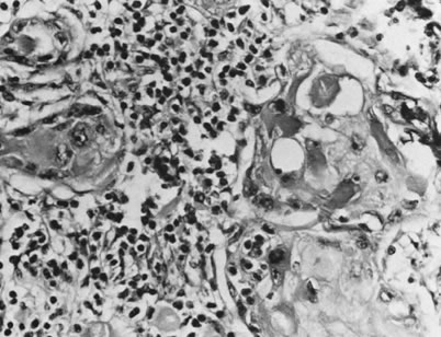 Basaloid carcinomas are described as squamous tumors that do not form keratin and are composed of smaller cells with an increased nuclear-to-cytoplasmic ratio. These are less common than the well-differentiated tumors and are associated with HPV, especially type 16.10 Warty (condylomatous) carcinomas have superficial features of condyloma acuminatum. Their prognosis appears to be intermediate between well-differentiated squamous cell carcinomas and verrucous carcinomas. They also are associated with HPV, especially type 16.10 The giant cell forms of vulvar carcinoma are characterized by multinucleated tumor giant cells and may have a poorer prognosis than the well-differentiated carcinoma. These tumors must be distinguished from malignant melanoma, which also may have tumor giant cells. An analysis of cases classified as giant cell carcinoma of the vulva showed that criteria described for giant cell carcinoma may be observed in vulvar malignant melanoma and that the use of immunohistochemical studies is essential to distinguish between the two (see section on melanoma, below).32 In a study of 50 squamous cell carcinomas, Lasser and coworkers33 described two patients in whom the tumor showed primarily an adenoid-squamous cell pattern. In 15 other patients, loci of adenoid-squamous change were evident in isolated areas. The adenoid-squamous pattern of growth is characterized by the formation of pseudoglandular spaces lined with a single layer of squamous cells (Fig. 12). Within the spaces, dyskeratotic and acantholytic cells may be present. Mucin stains do not show evidence of secretion. These adenosquamous areas are usually found in tumors that would otherwise be considered well-differentiated carcinomas with keratin pearl formation, and this pattern of growth has not been observed in metastases or in recurrent tumors. However, neoplasms with a predominantly adenoid pattern are poorly differentiated and have a poor prognosis. One study noted a 6% 5-year survival for such patients compared with a 77% survival for patients with conventional squamous cell carcinoma.34