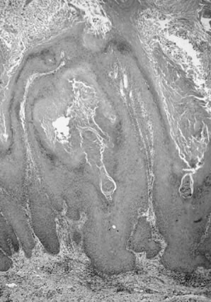 Vulvar human papillomavirus (HPV) infection is commonly manifested by exophytic condyloma acuminatum with the typical appearance of a verrucoid, elevated, discreet lesion. Such lesions are commonly multifocal and may involve the vestibule and perianal areas. The lesions of HPV also may be flat and macular, especially when they involve the nonkeratinized epithelium of the vestibule, vaginal introitus, or urethra. The HPV types most commonly associated with typical genital warts are HPV 6 and 11; however, high-risk types may also be found. Fifty percent of women with vulvar condyloma acuminatum also have cervical intraepithelial neoplasia. Typical exophytic condyloma acuminatum have a fibrovascular stalk, and the epithelial surface is acanthotic and often hyperkeratotic. The fibrovascular stalk is lacking in the flat condyloma acuminatum. Both exhibit similar epithelial changes. Microscopic features include a papillomatous lesion with some loss of epithelial maturation from the basal layer to the granular zone (Fig. 1). Basal and parabasal hyperplasia are usually present with accentuation of the intercellular bridges of the keratinocytes. Individual cell keratinization, dyskeratoses, and increased mitotic figures of normal morphology and location may all be present in varying degrees. Also seen are distinctive koilocytes, which are keratinocytes with distinctive perinuclear clearing and enlarged nuclei that may be hyperchromatic. The differential diagnoses of vulvar condyloma acuminatum include verrucous carcinoma; vulvar intraepithelial neoplasia (VIN); condyloma lata of syphilis; and in children, other polypoid tumors, including botryoid rhabdomyosarcoma. The diagnosis can be made definitively on histologic examination of biopsy material. Their presence in children should raise the question of sexual activity or abuse, although HPV infection can be acquired at birth or may be due to cutaneous HPV types. |
