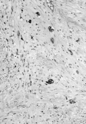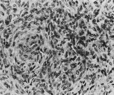 Fibrous histiocytomas can be malignant or benign. Those confined to the dermis, without infiltration into fat or subcutaneous fascia, are generally considered benign lesions, although they have the potential to recur locally. Wide local excision with an adequate deep margin is the treatment of choice. Careful pathologic examination of the deep margins is mandatory because lesions that involve the underlying fat, fascia, or muscle must be considered malignant fibrous histiocytomas (MFHs) until proved otherwise.1 MFH is rare on the vulva, but it is the second most common sarcoma of this site. This tumor typically presents as a solitary deep subcutaneous nodule or an ulcerated mass in middle-aged women.81,82 It is an aggressive tumor that freely infiltrates subcutaneous fat, fascia, and muscle. The tumor is thought to arise from histocytes that have undergone fibroblastic differentiation. MFH is characterized by marked pleomorphism with giant and multinucleated cells. The treatment is wide local excision or radical vulvectomy. Lymphadenectomy is reserved for those cases with clinical evidence of regional node involvement. Postoperative radiation therapy is believed to be of value in reducing local recurrence. The prognosis in patients with primary MFH is guarded.1 Dermatofibrosarcoma protuberans (DFSP) is believed by some pathologists to be an intermediate form between the benign and the MFH. They are typically superficial subcutaneous nodules that may infiltrate subcutaneous fat, but do not infiltrate into underlying fascia. Local recurrence may be seen, but metastases are rare.83,84 Microscopically, these three neoplasms (benign and MFHs and DFSP) show a similarity of cell type and tissue organization. The cells are spindle shaped and often have a foamy cytoplasm (Fig. 17). They are usually arranged in haphazard bundles, resembling straw cast on the ground, the so-called storiform pattern.