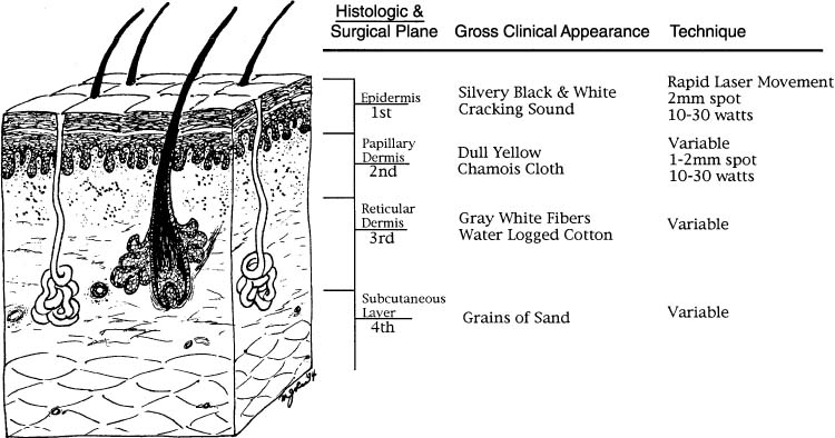 Treatment is justified largely for the prevention of progression to invasive cancer. Patients more likely to progress include those with high-risk molecular markers. Patients who are at risk for progression include immunocompromised HIV-positive women and transplant recipients. Other patients may be at high risk for progression based on molecular markers, such as multifocal disease, presence of VIN III, and markers of angiogenesis. Pregnancy may represent a transient immunosuppressive condition. As such, lesions that have been adequately examined on biopsy specimens to exclude cancer may be observed for spontaneous regression. It is imperative, however, to note the difficulty in excluding cancer in any lesion short of its complete excision.54 Despite the uncertainty that surrounds the prognosis of VIN lesions and their association with cancer, at this time, it is traditional to treat all VIN lesions after a variable period of observation to establish the diagnosis, rule out invasion, and document persistence.1,2,26,55 After cancer has been excluded, it may be appropriate under certain circumstances, such as the third trimester of pregnancy, to observe the patient for several months, hoping for spontaneous regression of the lesion. As previously mentioned, there are many reports in the literature of vulvar CIS spontaneously resolving.23,29,56 Aggressive treatment and follow-up of a large series of patients with VIN III was reported to be highly successful in preventing invasive disease. In a group of 102 patients with VIN III, treated and followed for 15 years, only one case of vulvar cancer was reported.51 In another group of 113 patients analyzed between 1961 and 1993, 87.5% of untreated patients progressed to invasive vulvar cancer, and 3.8% of treated patients later were diagnosed with invasive vulvar carcinoma.57 As understanding of VIN increases, it is hoped that clinicians will be able to discern which lesions can be observed and which need treatment because of symptoms or their risk of progression. This situation is analogous to the evolution currently taking place in the treatment of cervical intraepithelial lesions, although the study of VIN is at an earlier stage. One of the most important parts of treatment is delineation of the boundaries of disease. Many patients with VIN have multifocal or multicentric disease.23,26,50 Multifocal is defined as different sites on one organ and can affect 84% of patients.50 Multiple lesions on the vulva would be considered multifocal. Multicentric refers to disease on different organs at the same time, such as the vulva and the cervix. Of patients with VIN III, 35% have either the vagina or the cervix involved with a squamous cell neoplasia.58 For this reason, all patients with VIN should have a Papanicolaou smear and careful examination of the perineum, vagina, cervix, and anus.59 This approach is especially recommended for HIV-positive women, who may be at higher risk for multicentric disease.33 The clinician must consider the entire extent of the abnormalities present before initiating a treatment plan. The main method of treating initial VIN at this time is local ablative therapy. Before local destructive therapy is used, however, it is imperative that invasive disease be excluded. Some authors caution against ablative therapy with extensive VIN III because of the inability to exclude cancer.55 There are no randomized comparative trials of the different available modalities. Case series reports suggest, however, that efficacy rates are approximately equal.60 Because the superficial nature of VIN is now recognized, deep resections no longer are necessary. If the lesion is small, approximately 1 to 2 cm, a simple local excision suffices with primary closure. Given the frequency of multifocal disease, however, surgical excision often can be impractical, requiring extensive removal of tissue. Cryotherapy also may be used, although it is ill-suited for extensive lesions. For these reasons, laser therapy is currently the most popular local ablative method of treating VIN. Promising other therapies include photodynamic therapy and topical immune modulators. When invasion is excluded, therapy with the carbon dioxide laser is useful in treating large areas that have been defined clearly. Outlining the area to be treated requires magnification with a colposcope after application of 5% acetic acid. If the area is not marked before laser treatment, a leading edge of thermonecrosis produces a confusing pseudoacetowhite appearance. Guidelines for treatment depths are available and have been correlated with gross appearance and histologic levels (Fig. 2).61 Although there is no doubt that a laser can be used to destroy neoplastic lesions, learning the proper technique can be difficult and is best achieved through direct instruction in the clinical setting from an experienced physician. Even in expert hands, trying to control the exact depth of tissue destruction is difficult, given the multiple variables present in the clinical situation.62 In general, nonhairy vulvar areas require laser treatment to a depth of 1 mm; hairy areas should be vaporized to less than or equal to 2 mm.47 The most challenging VIN patients to treat are those who are immunocompromised by either transplants or HIV disease. For these patients, some sort of long-term maintenance therapy may be effective, such as weekly topical 1% 5-fluorouracil cream.63 Additional options include combination therapy with immunomodulators.64 In a small crossover study with no placebo control, VIN seemed to have responded to interferon-α.65 In addition to interferons, retinoids may be another area with significant therapeutic potential. Retinoic acid has shown efficacy in treating cervical intraepithelial lesions and has been shown to be active on vulvar dystrophies.66 Given the high spontaneous regression rate of VIN, however, these treatments are considered experimental and should be used only in i