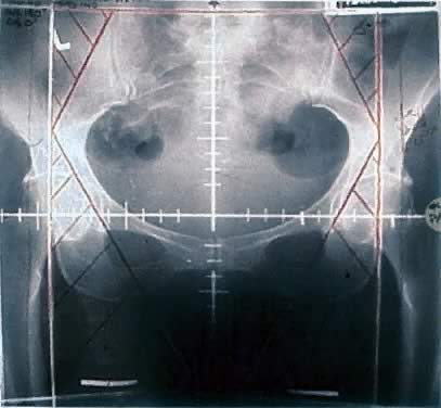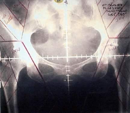 Radiation kills both cancer and normal cells primarily by two mechanisms. First, the indirect effect involves interaction of ionizing rays with water molecules to produce oxygen free radicals that in turn disrupt cellular DNA. Cancer cells are far less capable of repairing radiation damage than normal cells. This difference is exploited by dividing the total prescribed radiation dose into several fractions usually as one treatment a day or conventional fractionation. The interval between treatments allows tumor cells to repopulate. One strategy to counteract repopulation is hyperfractionation which refers to two or three radiation treatments a day separated by 4 to 6 hours to allow for normal tissue recovery. The second mechanism of radiation damage to cells is the direct effect or the interaction of energy beams with the target molecules. The first goal of radiation treatment planning is delivering a sufficiently high dose to tumor volume to cure disease or effect durable local control potentially, while minimizing both acute toxicity to normal tissues and reducing the risk of long-term complications. Treatment planning is a major challenge because the dose required to eradicate disease commonly approaches the dose associated with major complications. Dose-response curves for normal tissue complications are steep after crossing the threshold at which meaningful tumor response can be achieved. Given that both normal tissue and cancer cells are in the path of the radiation beam, the treating physician must pay careful attention to details of patient setup and to plan verification. In the past, external beam radiation treatments were delivered with Co-60 teletherapy machines. These devices had an active Co-60 source in the head of the machine that emitted gamma rays directed at the patient lying on the table below. Co-60 rays are not so penetrant in tissue as high energy megavolt photon and electron beams from linear accelerators that are widely available and are standard equipment in most cancer centers today. Co-60 teletherapy had been the standard means of delivering radiation in the United States until the early to middle 1980s when use of linear accelerators became widespread. High energy photon beams deposit ionizing radiation in tissue that attenuates the dose more gradually than with the less penetrant Co-60 rays. This beam characteristic allows target volumes that may be several centimeters below the skin surface to receive the full prescribed dose while keeping the skin dose relatively low. Co-60 treatments necessitated high skin doses to deliver dose to deeper targets adequately and was associated with far more morbid perineal reactions. Despite the advent of linear accelerators, the sensitivity of the perineum to radiation damage still frequently requires treatment breaks to allow completion of therapy. Nonetheless, modern equipment, computers, and the rapid development of increasingly sophisticated treatment planning software has enabled today's patients to receive radiation therapy more accurately, effectively, and with fewer side effects than ever before. Before a single radiation treatment is given, patient setup and field borders are arranged on a simulator table. Although not a treatment machine, the simulator reproduces the distances from the radiation beam to the treatment table as well as the angle and rotation of the head of the machine that delivers the energy beam. Patients rest in the supine position or with the legs raised and knees bent (frog-leg position). These are the best positions for targeting the perineum, groin and pelvis. Plain film radiographs are obtained in the simulator after review under fluoroscopy to confirm patient and field border setup. These simulation films are then compared with weekly port films that document actual radiation treatments. Adjustments are made as necessary so that the planned treatment is accurate and reproducible. Vulvar tumors require treatment of the primary site as well as draining lymph nodes. Areas at risk for harboring microscopic disease typically receive doses between 45 and 50 Gy, whereas gross disease usually requires doses above 60 Gy. Opposed anteroposterior (AP/PA) treatment fields encompass the pelvic lymph nodes, inguinofemoral lymph nodes and perineum. High-energy beams (10 mV or more) delivered from opposing sides of the target yield a homogeneous dose distribution across wide treatment depths. This characteristic is important because the target volume often lies across several centimeters of tissue, different targets lie at different depths, that is, the groin versus the pelvic lymph nodes, and because the body has a heterogeneous surface. Simulation films used for the treatment of a typical vulvar cancer patient are shown in Figures 3 and 4. The radiation beam can be pictured passing through the plane of the page. The grid marks the central rays of the photon beam and the straight lines at the corners represent the area in the beam's path, which is blocked by Cerrobend, a metal that is liquefied when heated, poured and then allowed to cool in the shape of the area of desired protection. Thus, 1-cm Cerrobend attenuates the radiation beam by 50%. Five to six centimeters of block are required to diminish the radiation dose to less than 5% at the surface of the skin. In the example shown, bowel and soft tissue that are not overlying or underlying targets of interest are blocked out. One structure of concern for radiation damage is the head of the femur. The posterior treatment field shown in Figure 4 does not pass through the femoral heads and therefore excludes the groin, which would be underdosed without a make-up dose from the anterior side. Because the inguinal lymph nodes lie close to the skin surface, treatment of this area with separate electron beams, which deposit more energy near the skin surface compared with photons, allows coverage of the groin while limiting the total dose to the femoral heads. A
