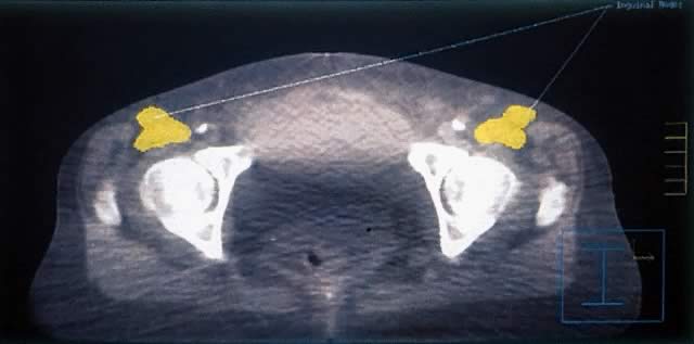 A different technique to cover the groin without overdosing the femoral heads involves the use of only photon fields. The anterior and posterior fields are identical to those shown in Figures 3 and 4, but no separate electron fields are used. Instead, a central partial transmission block is placed in the path of the anterior beam such that the primary site and pelvic nodes receive more dose contribution from the posterior field whereas the extended portion of the anterior field that covers the groin is unattenuated. The “wing field” technique has been well described and analyzed by Kalend and colleagues who found that the divergence of the posterior beam creates a 30% hot spot in the groin, which can be greatly reduced by tapering the edges of the anterior transmission block increasing dose contribution to the wing portion of the field from the anterior beam.51 Appropriate selection of target volume, that is, tumor and nodal groups at risk for disease recurrence, has previously been discussed in detail. In general, preoperative radiation treatment portals encompass the groin, perineum, and low pelvic lymph nodes, whereas postoperative treatment portals are tailored based on surgical findings. In the postoperative setting, efforts to reduce acute perineal reactions that frequently mandate treatment breaks have included use of a central block to permit treatment of the groin and pelvis only. Long-term results with this technique have been reported at the University of Minnesota where 27 patients were found to have a central recurrence rate of 48% following radical vulvectomy. Although this figure is far higher than had been seen by others using this technique, the use of midline blocks is discouraged.52 Because failure in the groin is disastrous, adequate dosage of this area is critical to successful radiation therapy. Groin nodes are not midplane structures and vary in depth among different patients. In Protocol 88, the GOG attempted to answer the question of whether radiation therapy to the clinically negative groin could replace groin dissection. This study was appropriately terminated when it was noted that patients in the radiation study arm experienced a comparatively high groin recurrence rate, but it has been roundly criticized because of poor study design with respect to defining the target volume and ensuring adequate dose delivery to the inguinofemoral nodes.29,53 With a combination of electrons and photons, GOG Protocol 88 prescribed dosage to a depth of 3 cm from the anterior skin surface in all patients. This depth may cover superficial inguinal nodes adequately in most cases but may not cover deep inguinal nodes that are also at risk even with early lesions. Analysis of pretreatment CT scans of the 5 patients in the radiation study arm who suffered groin relapse has shown that all groins received less than the prescribed dose and 3 patients were underdosed by at least 30%.54 Use of opposed photon fields alone to encompass the groin was reviewed by Petereit and colleagues. After radical vulvectomy, 48 patients fell into two groups, one receiving 50 Gy of inguinofemoral radiation and the other undergoing lymphadenectomy. Actuarial nodal control was almost equivalent with no difference in survival noted. Infection and wound separation was much higher in the groin dissection group whereas lymphedema was occurred in only 9%. No avascular necrosis of the head of the femur was reported.55 The experience of GOG Protocol 88 illustrates the importance of careful and accurate treatment planning. The value of planning treatment of the groin with CT scans was confirmed by McCall and coworkers at Loyola University Medical Center where 100 CT scans of women without groin adenopathy or prior surgery were analyzed. Using the guidelines of the GOG study, isodose curves were reconstructed for hypothetical groin irradiation. More than 50% of the women in the study would have received less than 60% of the prescribed dose across the groin and only 1 in 5 women had all groin nodes at a depth of 3 cm or less.56 The likelihood of underdosage of the groin without CT planning was elaborated in a review of 31 patients with gynecologic cancers at risk for groin metastasis. Almost one third of superficial groin nodes are at a depth from the skin surface exceeding 3 cm and all deep inguinal nodes are outside this range.57 Treatment planning CT scans as shown in Figure 5 can localize superficial and deep inguinal nodes that can be readily identified at the level of inguinofemoral vessels. At the time of simulation, fiducial markings correspond to the central rays of the radiation beam and are visible on the subsequent CT scan facilitating digital reconstruction of dose distribution in axial, coronal, and sagittal planes. Figure 6 shows a composite dose distribution in the axial plane of the mixed photon and electron fields of Figures 3 and 4. Each of the dose regions (or isodose curves) represented by the various lines is normalized to a reference at the central axis. The delivered dose is close to 100% of the prescribed dose across the entire region corresponding to the marked groin nodes on the planning CT from Figure 5. Optimization of dose delivery with treatment planning software and improved imaging should permit individualized radiation therapy. In-field failures potentially can be significantly reduced with careful attention to treatment technique and patients' individual anatomic considerations.