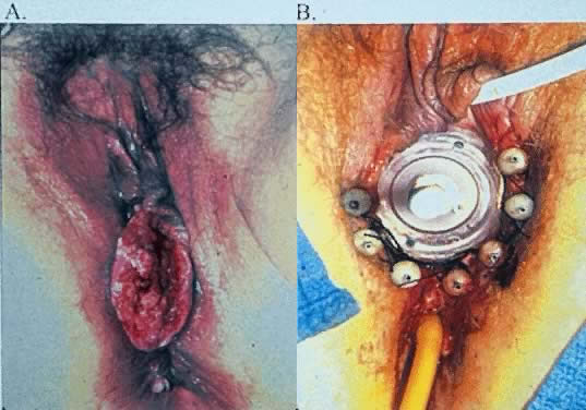 Brachytherapy The practice of placing radiation sources within and adjacent to tumors is called brachytherapy. The earliest and still the largest published series describing the use of radiation implants in vulvar cancer patients dates back to 1949. Margaret Tod at the Holt Radium Institute in Manchester, England treated 116 patients with early and advanced lesions using radium needles inserted with freehand placement and kept in place for 7 days. Patients were selected on the basis of medical inoperability in some cases, but most frequently they had tumors near the urethra or vaginal orifice. The overall 5-year survival rate was 25% for the entire group but was 33% for patients with early lesions and 14% for those with advanced disease. Although not impressive compared with surgical series, these results established the feasibility of brachytherapy for patients in whom radical surgery was undesirable or not practicable.58 Technologic advances in treatment planning have renewed confidence in the accuracy of not only external beam radiation but also radiation implants. In medical centers in the United States and Europe, computer assisted calculations of dose distribution over target volumes and novel source applicators were used in the treatment of recurrent and advanced vulvar cancers.59–61 Figure 7 shows a commonly used applicator with holes at regular intervals to allow placement of Ir-192 ribbons. In this example, an inoperable tumor extending into the vaginal orifice receives an adequate dose by the contribution of numerous source positions. Although efficacy of these procedures has been clearly demonstrated, a high risk of severe tissue necrosis has also been observed. Most reports have included heterogeneous mixtures of patients treated sporadically with brachytherapy, but local control and survival rates appear to be slightly less than would be expected for comparable patients treated surgically, whereas the risk of local necrosis can be as high as 20%.62,63