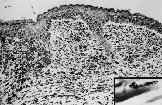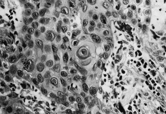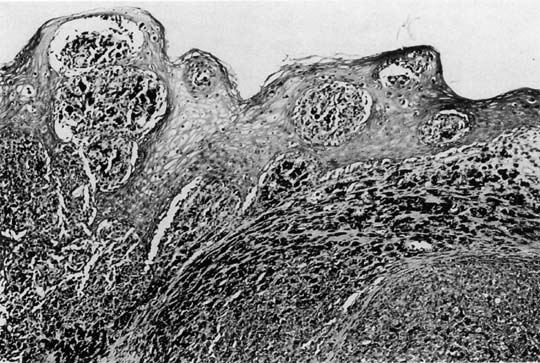 VAIN has been proposed as a precursor of vaginal cancer, although the true malignant potential of VAIN is unknown. The “HPV field-effect” hypothesis also has merit, because patients with VAIN commonly had cancer in other genital organs. Women with primary vaginal carcinoma have a 20% chance for previous invasive cervical cancer and a 70% chance for previous cervical intraepithelial neoplasia (CIN).17,23 The median interval between the diagnosis of cervical cancer and the diagnosis of vaginal cancer is 14 years, with a range of approximately 6 to 28 years. Sixteen percent of these patients have a history of previous pelvic radiation.10,18 It is often difficult to accurately determine the spread into subvaginal tissues, particularly the spread of anterior and posterior lesions. Therefore, differences in clinical observations are common. This is reflected in the wide range of reported stage distributions and survival rates per stage. The best data estimate that approximately 25% of patients present with stage I, 33% with stage II, 25% with stage III, and 15% with stage IV disease (Table 2).10,12,33,34,35 The most common site for squamous cell carcinoma is the upper third of the vagina. Fifty-one percent of these lesions are found to arise from the upper third, 19% from the middle third, and 30% from the distal third. Fifty-seven percent of tumors originate from the posterior wall, 27% from the anterior wall, and 16% from the lateral wall.23,33,34,35 Tumor size can range from an occult lesion to a large mass measuring more than 10 cm in diameter. 35 Grossly, these tumors may be polypoid fungating masses or indurated, ulcerative plaques. On microscopic examination, the carcinoma consists of malignant squamous cells infiltrating from the vaginal epithelium and extending between the submucosa (Fig. 1). Cords of malignant cells advance into the submucosa and are usually surrounded by a large inflammatory reaction. Initially, local extension is into the submucosa, with later spread into the paracolpium and parametrium.36,37 Squamous cell carcinomas are usually moderately differentiated and nonkeratinizing. The degree of histologic differentiation, based on the amount of keratinization and number of squamous pearls, does not constitute a sound basis for assessing prognosis.24 The major prognostic factors are the stage of the tumor at the time of diagnosis and the size.16