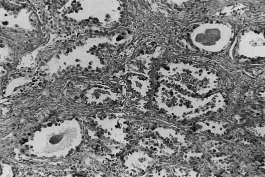 Verrucous carcinoma is a distinctive variant of well-differentiated squamous cell carcinoma that rarely occurs in the vagina.38,39 This tumor typically presents as a relatively large, well-circumscribed, soft, cauliflower-like mass. Microscopically, it exhibits a papillary growth pattern with marked hyperkeratosis and broad, bulbous pegs of acanthotic epithelium that push into the underlying stroma. Cytologic features of malignancy are lacking. Because of its well-differentiated character, the microscopic diagnosis of invasive carcinoma may be difficult, especially if the biopsy specimens are superficial. Verrucous carcinoma can recur locally after surgery, but it rarely metastasizes. This behavior difference justifies treating this carcinoma as a distinct tumor entity. Adenocarcinoma Approximately 5% of primary vaginal malignancies are adenocarcinomas (Table 3). Whenever this diagnosis is considered, it is necessary to rule out metastatic lesions from the bowel, uterus, or ovary. The most common variant is the clear-cell adenocarcinoma, which can occur spontaneously and in women with in utero exposure to DES.6,7,8,14,40 Primary non-DES-related adenocarcinoma of the vagina is rare and occurs predominately in postmenopausal women. DES was used extensively in the late 1940s and early 1950s to maintain high-risk pregnancies, such as those in women with a past history of abortion, diabetes, or multiple gestation.41,42,43 Approximately 5% of all pregnant women in the United States during the late 1940s and early 1950s used DES. In 1953, Dieckmann and colleagues41 reported that DES offered no improvement in fetal outcome, and its use gradually decreased until it was discontinued by the Food and Drug Administration in 1971. In the same year, Herbst and associates7 reported seven young women (ages 15–22 years) who presented to Vincent Memorial Hospital (Boston, MA, USA) between 1966 and 1969 with a diagnosis of clear-cell carcinoma or endometrioid-type adenocarcinoma with intrauterine exposure to DES. The Registry for Hormonal Transplacental Carcinogenesis and the Registry for Research on Hormonal Transplacental Carcinogenesis were established to correlate clinical and pathologic data on these unusual cancers.44 Many DES-exposed women have unusual vaginal epithelial changes such as adenosis.40,45 Vaginal adenosis is a condition in which müllerian-type glandular epithelium is present after vaginal development is complete. It most commonly involves the anterior wall and upper third of the vagina, and the classical gross appearance is that of red, velvety, grape-like clusters.7,8,14 The process may involve the surface epithelium or glands in the superficial stroma. Microscopically, the glandular epithelium can be composed of any of the müllerian epithelial cell types, but cervical-type mucus cells are most common. The glands within the lamina propria may be lined by tuboendometrial-type epithelium, which exists in approximately 25% of cases and is more common in the lower vagina. Robboy and associates45 suggested that atypical vaginal adenosis and atypical cervical ectropion of the tuboendometrial type are precursors of adenocarcinoma. Most DES-associated tumors have occurred in women between ages 17–21 years (median age: 19 years).6,7 Clear-cell carcinoma develops in 0.1% of exposed women. The DES-associated clear-cell cervical adenocarcinomas have a predilection for the ectocervix. Most vaginal carcinomas arise on the anterior wall, usually in the upper third, corresponding to the most common site of adenosis. The tumors vary greatly in size (range: 1–30 cm). Most of the tumors are exophytic and superficially invasive.46 The larger tumors are polypoid and nodular, and the smaller tumors appear flat or ulcerated with a granular or indurated surface. Small tumors can be easily missed on colposcopic examination if confined to the lamina propria and if covered by intact, normal epithelium. These small tumors are usually asymptomatic and are detected only by palpation and directed biopsies as part of a thorough examination for a DES-exposed patient. Microscopically, they exhibit three basic histologic patterns: tubulocystic (most common); papillary; and solid.40 The tumor cells are cuboidal or columnar with clear cytoplasm and a distinct cell membrane, or they are the hobnail-type with large, atypical, protruding nuclei rimmed by a small amount of cytoplasm (Fig. 2). Glycogen is also found to be abundant.