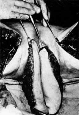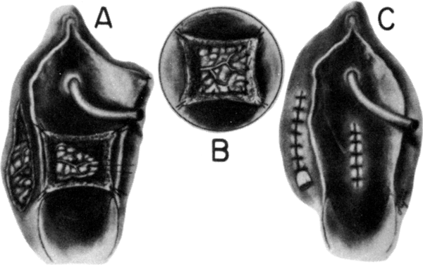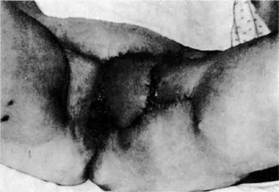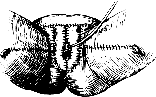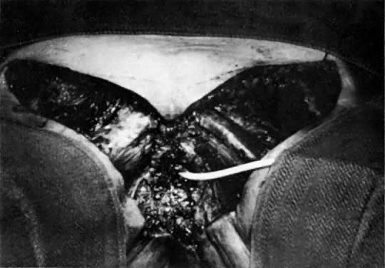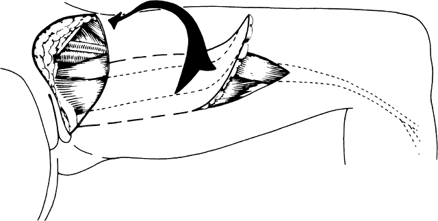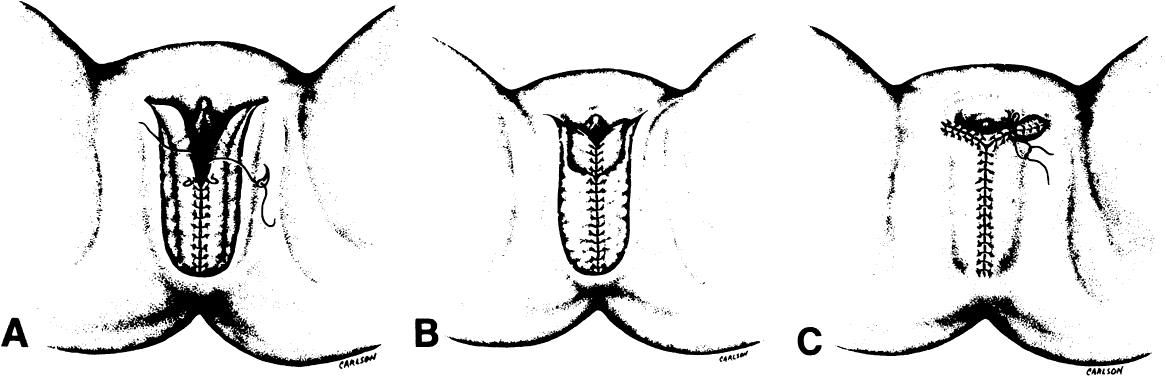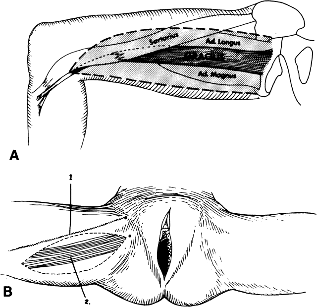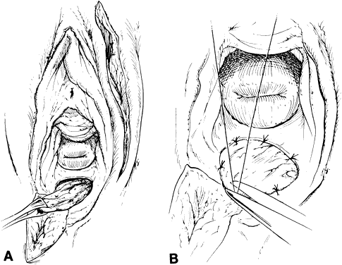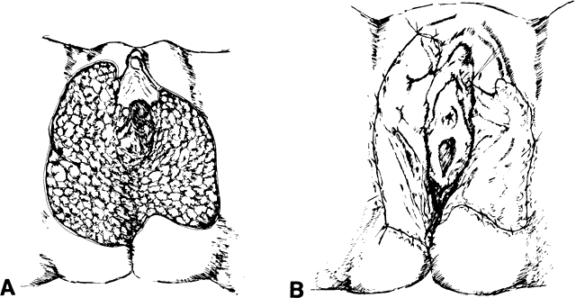 Split-Thickness Skin Grafting The establishment and easy applicability of split-thickness skin grafts have enhanced the gynecologists' role in reconstruction of the vulva. When wide local excision of vulvar lesions creates large defects, a segmental skin graft can be applied so that skin approximation without tension will ensure a better cosmetic result. Primary closure and segmental grafting can be used at the same surgical sitting. The presence of multifocal vulvar, perineal, and perianal lesions occasionally necessitates the removal of multiple areas of skin. Reapproximation is difficult. The technique of removing just the vulvar skin (i.e., skinning vulvectomy) and preserving the subcutaneous tissue and vulva blood supply is preferred.1 A rich bed of tissue is available for skin-graft applications (Fig. 1). Although operative time and hospital stay are lengthened when skinning vulvectomy and grafting are performed, better cosmetic results with few residual sequelae are obtained. Among these sequelae are graft-take failure in the range of 5% to 15% and an impairment of sensation in both the grafted area and the graft site. The mons pubis is a potential graft selection site. Use of Incisions and Skin Grafts Introital stenosis after surgery is not always responsive to dilation. Simple surgical procedures, such as vertical incisions at the fourchette, constitute a first approach. These incisions are closed in horizontal fashion to widen the introitus. In cases of introital stenosis or the absence of a perineal body, a Z-plasty type of operation can be performed.2 If larger areas of the vulva need to be covered after radical surgery, local flap grafts can be used.3,4 Use of the Labia Minora (Full-Thickness Graft) Patients with prior vulvar surgery may experience complications such as dyspareunia, introital stenosis, hoods over the urethral orifice, vulvar scarring, and vulvar breakdown with infection. In these patients, vulvar reconstruction can be performed by using full-thickness grafts.5,6 Full-thickness grafts use both the epidermis and the dermis. In general, these grafts can be used to cover small areas so that the donor site can be closed primarily. For the gynecologists, possible donor sites include the labia minora,5 upper medial thigh, and groin.6 The size of the graft should be larger than the area to be covered secondary to the high primary contracture rate. The use of skin grafting at the time of initial vulvar surgery can circumvent many of the aforementioned complications. Labial Pedicle Flap (Martius) After radiation therapy, hypoxia, necrosis, and ulceration can compromise genital tract tissues. Conditions such as vesicovaginal, rectovaginal, and urethrovaginal fistulas can be the sequelae of pelvic irradiation. Repair of injured tissue in these areas necessitates the introduction of healthy unirradiated tissue. The closure of these defects can be approached with the use of the labial fat pad, a technique originally devised by Martius.7 The Martius procedure provides tissue support and a new blood supply to the surgical site. The labial fat pad is supplied anteriorly by the superior external pudendal artery and inferiorly by the perineal branch of the internal pudendal artery. As a labial pedicle, the bulbocavernosus muscle and surrounding fat is isolated. This pedicle is tunneled paravaginally and then introduced into the vaginal canal, where it can be used to repair bladder and urethral fistulas7–9 or rectovaginal fistulas.10,11 Both labial fat pads can be used (Figs. 2 and 3). Rhomboid Flap Creation of a rhomboid flap is a useful approach for repairing defects occurring after partial vulvectomy has been performed for carcinoma in situ of the vulva or re-excision of the vulva for in situ disease.12 The flaps are created such that a graft is not necessary and adequate closure without tension is obtained.13 |