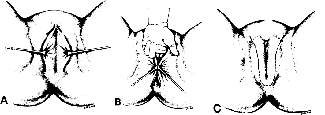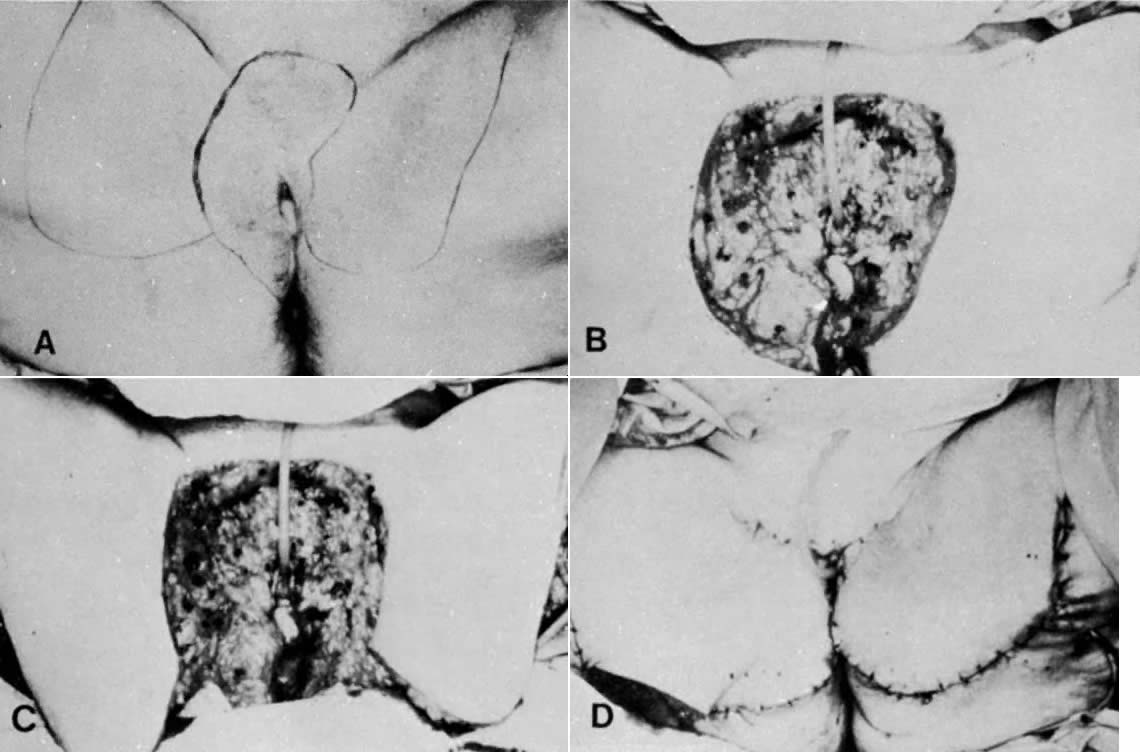 The technique of vaginal reconstruction depends on the length of the remaining vagina, the viability of the tissue, and the accompanying deficit as a result of the treatment method. Procedures that have been described include split-thickness and full-thickness skin grafts, peritoneal grafts, omental grafts, vulvovaginal grafts, large- and small-bowel grafts, bladder segment grafts, and myocutaneous flaps. Split-Thickness Skin Grafting In the absence of irradiation, vaginal reconstruction can be achieved by the placement of a split-thickness skin graft in the vaginal canal. Skin can be taken from the lower abdomen, the lateral hairless inguinal area, the posterior medial thigh, or the posterior medial buttocks. The graft usually varies from approximately 0.015 to 0.017 inches in thickness. Initially, split-thickness grafts contract approximately 20% compared with full-thickness grafts, which may contract up to 50%. However, the secondary contracture, which occurs as the wound heals, is much less for the thicker grafts. Therefore, thicker grafts are more pliable and contract less. The donor site usually heals without difficulty in 14 to 21 days; however, a residual scar will remain at the donor site. Graft-take ranges from 75% to 90%. This method of creating a neovagina can be used in patients who have had a partial or complete vaginectomy for intraepithelial or invasive carcinoma of the vagina or in patients who have had either an anterior or a total pelvic exenteration. When the latter is performed, creation of a vascular bed may be required; this can be created surgically with the use of an omental pedicle flap or muscle pedicle flap. When using a split-thickness graft, a vaginal stent is necessary to keep the vagina patent. The stents are tailored to the size of the vagina. They should be easy to remove and should not remain in place for prolonged amounts of time. Excessive pressure should not be exerted on the graft as it can lead to vascular compromise and draft necrosis. After stent removal, topical estrogen can be used and the vaginal canal is kept open, either naturally or by the use of a mold. The mold is used for approximately 3 to 4 months if the patient is not sexually active; less time is required if the patient is sexually active. Complications of vaginal reconstruction include loss of viability of the graft, stenosis of the vagina, and rectovaginal and vesicovaginal fistula. Long-term complications of vaginal grafts include vaginal dryness, vaginal prolapse, and the rare development of squamous cell carcinoma of the graft.14 Thus, split-thickness skin grafts have emerged as one of the two more commonly used techniques for reconstruction of the female genital tract after treatment for gynecologic malignancies. Use of Pelvic Peritoneum or Omentum When the length of the vagina would be compromised at the time of radical or ultraradical surgery, intraoperative procedures can be used to lengthen the vagina. A simple procedure involves the use of pelvic peritoneum.15 Peritoneum from the vesicouterine pouch or from the cul-de-sac (extension of the peritoneum from the bladder and rectum) is preserved at the time of radical surgery and attached to anterior and posterior vaginal edges. The most superior or cephalad peritoneal edges are sutured in the midline. Thus, a peritoneal pouch that is an extension of the existing vaginal canal is created. Using this method, the vaginal depth can be extended by at least 2 to 3 cm (Fig. 4). In addition, omental pedicle16 or pelvic peritoneum15,17 can be used to cover the pelvic floor and the dome of the denuded vaginal canal. Approximately 3 to 6 weeks after surgery, after vaginal patency is maintained, a split-thickness skin graft can be applied to the vaginal tube. Variation of Standard Incisions VULVOVAGINOPLASTY. The current-day procedures use either the basic technique or minor modifications of the original Abbe-McIndoe-Williams procedure.18 This procedure begins with an incision of the labia majora as outlined in Figure 5. The inner lateral edges of the incised skin are then approximated to create a tubular vagina (Fig. 6). This tube is interior to the reapproximated outside edges of the incision. This technique allows the creation of a functional vagina in approximately 6 to 8 weeks. Advantages of this procedure are that dissection of the perineum is not necessary, the vagina retains its sensory function, routine dilation is not required, hospitalization is decreased, and the patient is able to ambulate early. This procedure is exceedingly useful after vaginectomy or when shortening of the vaginal canal has occurred, such as after radical hysterectomy or vaginal irradiation, when the length of the vagina is compromised. Among the complications of this operation are stenosis of the canal, prolapse of the vagina, and the rare occurrence of either rectovaginal or ileovaginal fistulas. A change in the direction of the vaginal canal occurs after surgery. In addition, the vaginal skin usually is dry, and lubrication is required before coitus. Occasionally, there is hair growth in the neovagina. PERINEAL INCISION. Another technique reported by Simmons and Millard19 and West and coworkers20 for creation of a vagina involves the dissection and creation of a new vagina between the compromised posterior vagina and the anterior rectum. This rare surgical procedure is used when there is severe vaginal stenosis secondary to irradiation. A vaginal pouch as large as 10 cm in length and 5 cm in width can be created and lined with a split-thickness skin graft. A vaginal mold and continued vaginal dilation are required to prevent scarring. Organ Substitution SEGMENT OF BOWEL. In the past, the intestines have been used to fashion a vaginal tube. At the time of exploratory celiotomy, a vaginal tube can be created by using either a loop of ileum or a segment of the sigmoid colon.21 Preservation of the blood supply to the bowel segment is critical to the succes