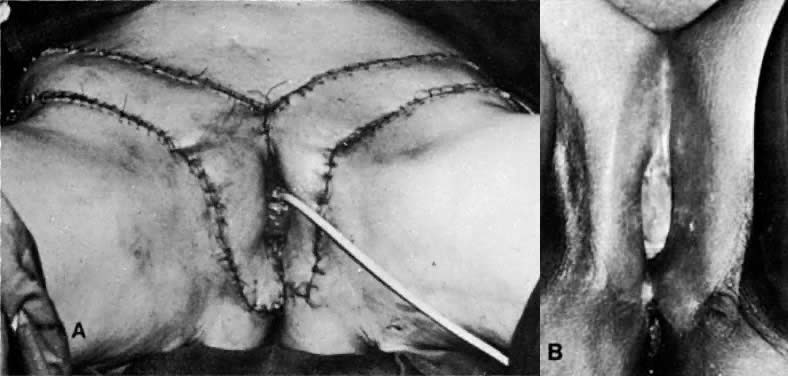 The surgical techniques used in reconstructive procedures on the female genital tract range from simple procedures involving the application of split-thickness skin grafts to very complicated procedures in which large segments of skin and underlying tissue, including muscle, are used as flaps to cover gaping defects created at the time of radical or ultraradical surgery. These techniques include grafting procedures, realignment of standard incisions, the use of vascular pedicle flaps, and organ substitution. These procedures can be further categorized as follows: Grafting Split-thickness skin graft Realignment of Standard Incisions Z-plasty Use of Vascular Pedicle Flaps Simple flaps Organ Substitution Transplantation of the bladder dome |