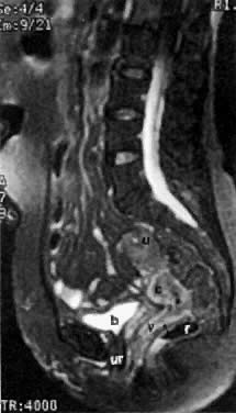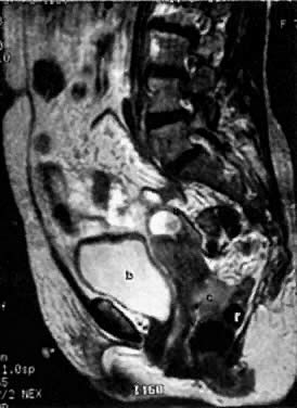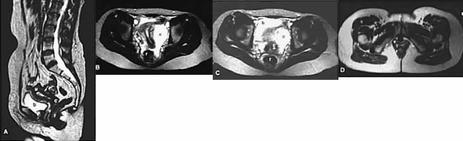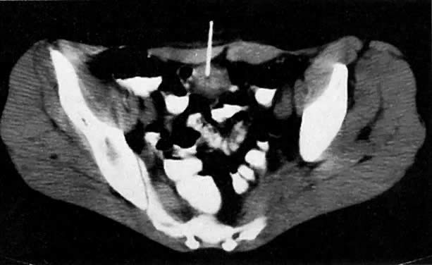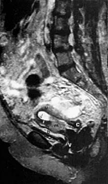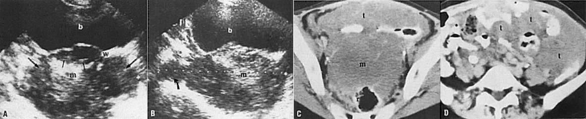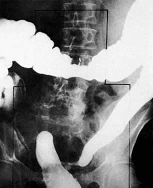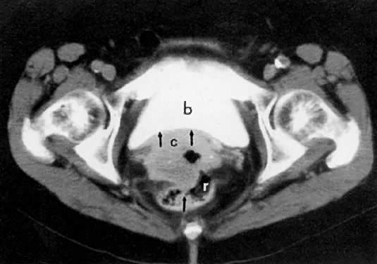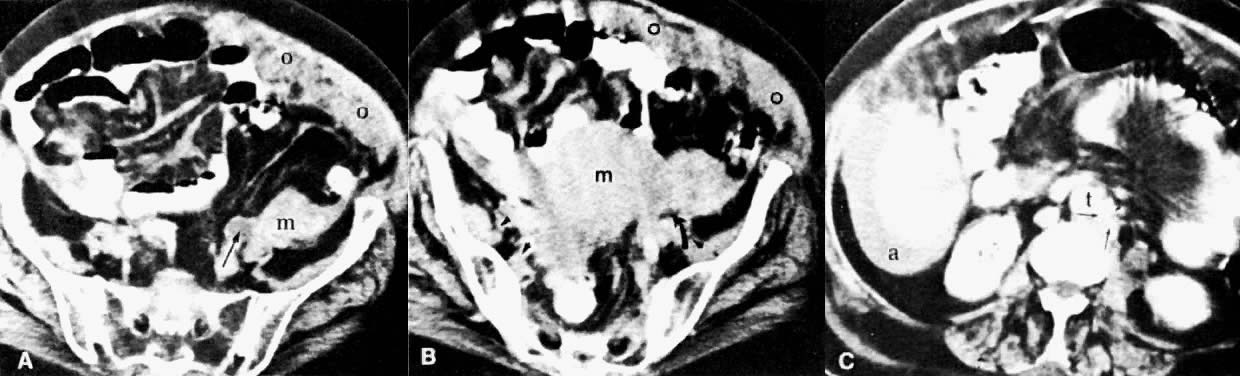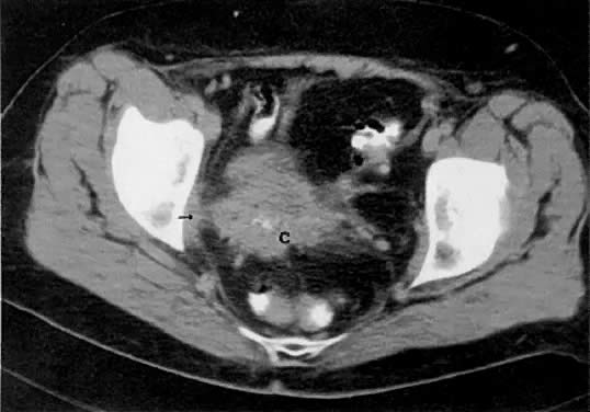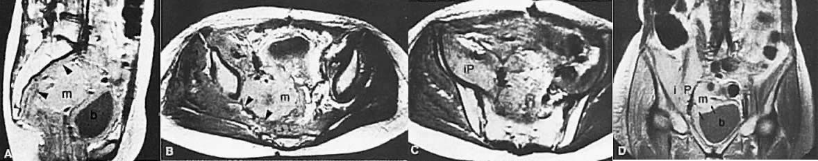 More recently, CT with opacification of the bowel by diatrizoate sodium diluted to 2% or barium sulfate diluted to 2% was shown to be capable of establishing the presence or absence of small-bowel obstruction. In addition, in most patients, CT has the benefit of determining the cause of obstruction and the presence or absence of metastatic tumor to the small-bowel serosa and mesentery (see Fig. 24D).114,115 Both MRI (see Fig. 19) and CT (see Fig. 24C) may be helpful in detecting local spread to the rectum. |