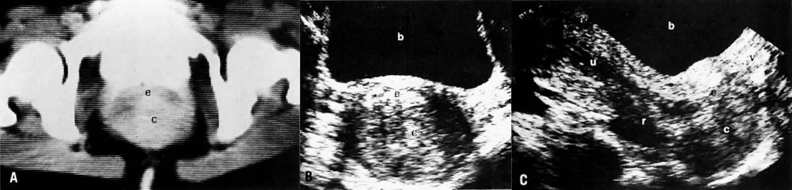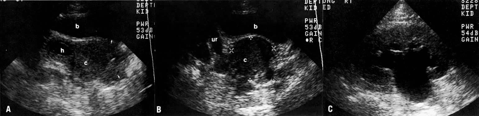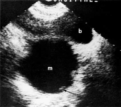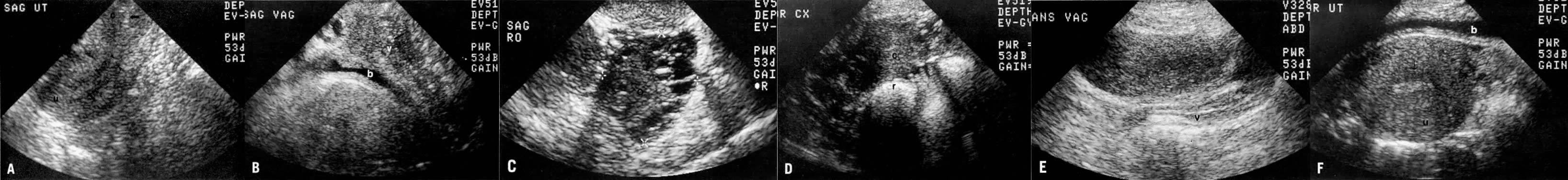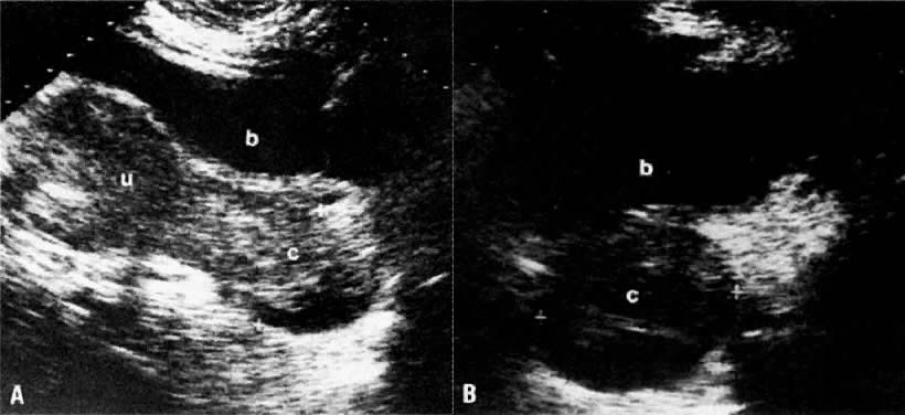 Two distinct layers are seen in the vagina on T2-weighted images: an inner zone of high signal intensity, which represents the vaginal epithelium and mucous glands; and an outer zone of low signal intensity, which represents the vaginal wall. The vaginal wall can be separated easily from the urethra and rectum on T2-weighted images (Fig. 1D).6 On transvaginal ultrasound (TVUS), the cervix is seen as a medium-echogenicity, 3- to 4-cm long, 3-cm thick cylindrical structure. Two layers can be identified in the cervix: the hyperechoic cervical canal and the medium-echogenicity stroma (Fig. 3A and Fig. 1D). Neither of these layers varies markedly in appearance or thickness during the menstrual cycle. Two distinct layers are seen in the vagina on TVUS: an inner hyperechoic zone, which represents the epithelium and mucous glands; and an outer hypoechoic zone, which represents the muscular wall (Fig. 3B and Fig. 1E). Diagnosis Diagnosis of cervical carcinoma is usually made by history, physical examination, Pap smear, and in certain cases, dilatation and curettage. Radiology plays a complementary role in the more difficult cases. On MRI7 and other cross-sectional imaging techniques, the cervix is usually normal in appearance in early cervical cancer. Locally confined cancer appears as a focal mass of medium signal intensity, which either distends the endocervical canal or focally disrupts the normal low-signal-intensity cervical stroma on T2-weighted MRI (Fig. 4A). Cervical enlargement (see Fig. 2B; Fig. 5A) is a typical finding of cervical carcinoma on computed tomography (CT). After intravenous contrast material administration, necrotic soft-tissue masses of the cervix can be identified as low attenuation areas.8 Despite technical advances in CT, its accuracy for detecting cervical tumors, which has been reported to be 63% to 80%, remains less than that of the clinical, ultrasound, or MRI examination.9,10 In locally confined disease, a cervical mass may be seen by ultrasound (Fig. 5B and C). In locally advanced disease, the cervix may become diffusely enlarged, inhomogeneous, and irregularly marginated (Fig. 6A and B). The presence of hydrometras should raise the suspicion of cervical or endometrial carcinoma. It is best demonstrated by ultrasound (see Fig. 6A), but can be seen by both MRI (Fig. 7) and CT (Fig. 8).11,12 This finding, however, is nonspecific because it can also be seen in benign cervical strictures caused by either previous cervical inflammation (Fig. 9) or pelvic irradiation (Fig. 10).