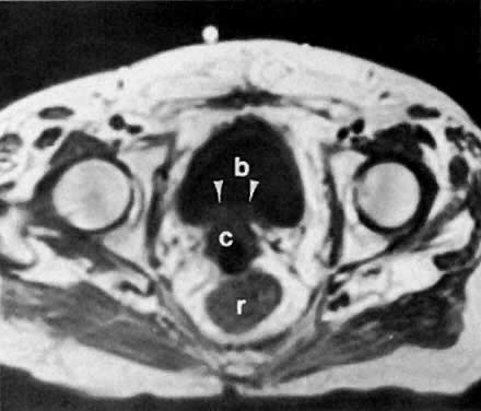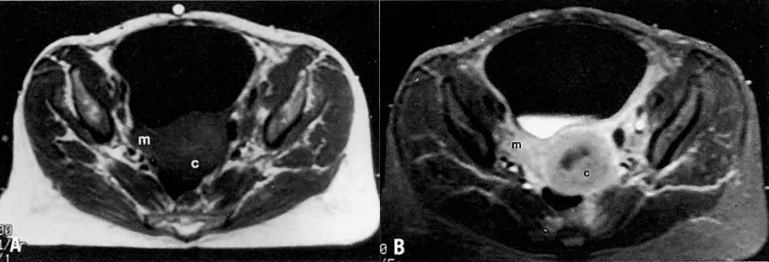 LOCAL MRI STAGING. With its improved soft-tissue contrast resolution and multiplanar capability, MRI is very useful in local staging of cervical carcinoma. Low signal intensity surrounding the tumor in the cervix and preservation of fat planes are consistent with tumor confined to the cervix (Fig. 14A). Stage IIA is indicated by the loss of the normal low signal intensity of the vaginal wall (Fig. 15). Stage IIB is indicated by the presence of abnormal thickening of the parametrium on T1-weighted MRI (see Fig. 2A; Fig. 16A). On T2-weighted images, stage IIB is depicted as increased signal intensity in the parametrium with the loss of the normal low signal intensity of the cervical stroma.9 Stage IIIA is indicated by the loss of low signal intensity of the wall of the lower third of the vagina. In stage IIIB, the lateral pelvic wall muscles lose their normal low signal intensity, with loss of the fat planes separating these muscles from the tumor on T1-weighted images (Fig. 17A and B). Stage IVA is indicated by loss of the normal low signal intensity of the bladder wall (see Fig. 17D; Fig. 18) or rectal wall (Fig. 19), associated with wall thickening and/or intraluminal mass.26,27