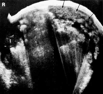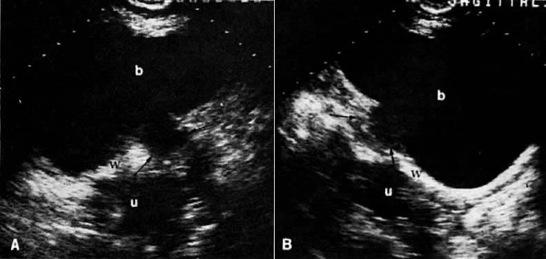 Several studies have shown that MRI improves the accuracy of parametrial assessment over that of the clinical examination.28,29,30,31 In one study with surgical correlation, the accuracy of detecting parametrial involvement by MRI was 92% compared with 78% by clinical examination, and the positive predictive value was 89%, and negative predictive value was 92%.9 Most errors occur because of overstaging. In a study of 57 patients by Hricak and colleagues,26 MRI overstaged the tumor in 11 patients and understaged it in 3 patients, yielding an overall accuracy of 81%. In this study, the accuracy of MRI was 88% for detecting parametrial extension, 95% for vaginal extension, 93% for pelvic sidewall extension, and 96% for bladder wall invasion. In another study of 67 patients, Togashi and co-workers27 overstaged the tumor in 6 patients and understaged it in 10 patients. Accuracy was 89% for parametrial tumor extension and 83% for vaginal involvement. In patients with large tumors or tumors located in an area difficult to evaluate, MRI can accurately assess tumor volume and extent.2,6,28,29,30,31,32 As tumor diameter approaches 3 cm, approximately 50% of these patients will have lymph node metastasis. Peritumoral inflammatory reaction can mimic parametrial involvement, causing tumor overstaging on T2-weighted imaging.33 In addition to edema, factors including volume averaging, bowel peristalsis artifact, close proximity of structures, obliquity of planes, and anatomic variations may obliterate fat planes between the tumor and the surrounding organs, thus increasing the false-positive rate, especially in advanced disease.34 Gadolinium-enhanced T1-weighted MRI techniques do not seem to improve visualization of stromal invasion of cervical carcinoma, but do improve staging in advanced cases (see Fig. 16A and Fig. 16B).35 Recent studies have shown that gadolinium-enhanced dynamic MRI may be superior to T2-weighted MRI in the evaluation of stromal invasion.12 Fat suppression techniques may also better delineate the tumor margins (Fig. 14B) and detect bladder or rectal wall invasion.36 MRI using endorectal surface coils may also prove to be a promising technique because of improved resolution over conventional MRI techniques.37 LOCAL ULTRASOUND STAGING. Ultrasound may play a role in the evaluation of tumor extension to the parametrium and the pelvic sidewall in patients with an equivocal pelvic examination.38,39 In stage IB, the tumor is confined to the cervix on ultrasound, without parametrial extension (see Fig. 5B and C). In stage IIB, a tongue of the hypoechoic soft-tissue mass extends laterally from the cervix (see Fig. 6B). More recently, high-resolution transrectal ultrasound was found to be more sensitive in assessing parametrial tumor spread compared to clinical evaluation (78% vs 52%, respectively).40 Ultrasound is also capable of detecting tumor extension into the bladder (Fig. 20),39,41 hydronephrosis (Fig. 6C),38 and/or ureteral obstruction (see Fig. 6B). Unlike CT, however, it cannot always reliably evaluate the level and cause of the obstruction. |