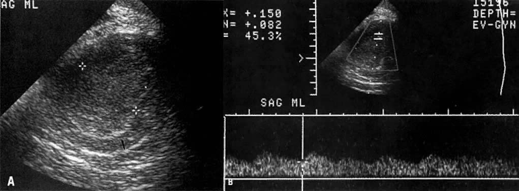 Methods of Spread Tumor spread to the liver from gynecologic malignancies is not common. It occurs predominantly by peritoneal seeding, and rarely by hematogenous metastases. Radiologic Examinations and Findings CT is a reasonably sensitive and specific modality for the detection of liver metastases.116 Most metastases are less dense than the normal liver parenchyma and are relatively well demarcated (Fig. 45A). Occasionally, however, the margins will merge imperceptibly with the liver parenchyma. Cystic metastases are seen with rapidly growing tumors, such as leiomyosarcoma. Peritoneal seeding on the liver capsule from ovarian neoplasms gives a characteristic scalloped appearance to the liver margin. Punctate or homogeneous calcifications can be seen in metastatic mucinous cystadenocarcinoma. New CT techniques, including spiral CT and CT angiography, are able to detect most hepatic metastases. The latter involves the introduction of contrast material directly into the superior mesenteric artery and allows improved contrast opacification of the liver and detection of very small metastatic deposits. Ultrasound is also fairly accurate in detecting liver metastases. Both ultrasound and MRI are predominantly used for further characterization of lesions seen on CT. Ultrasound can readily differentiate true cysts and hemangiomas from solid and cystic metastases (Fig. 46). The introduction of color and spectral Doppler has increased the specificity of ultrasound in differentiating benign from malignant solid liver tumors in some cases. In malignant tumors in general, spectral Doppler shows an increase in diastolic flow and, to a lesser extent, in systolic flow, resulting in a decrease in the resistive index to 0.4 or less. Benign tumors, however, show a higher resistive index because of the absence of the characteristic neovascular flow pattern. However, because there is considerable overlap in the Doppler findings, this modality cannot be relied on by itself for the differentiation of benign from malignant tumors.
