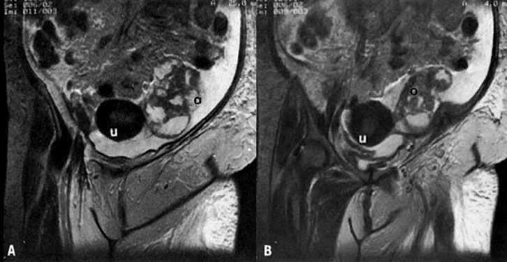 Physical examination after radiation treatment may be limited. Radiologic procedures are helpful in monitoring the size of the tumor in patients undergoing radiation or chemotherapy. MRI (see Fig. 4A and Fig. 4B) and CT can be used to monitor tumor response to treatment and to assess tumor recurrence. It may be difficult, however, to differentiate inflammatory changes and fibrosis caused by surgery or radiation from tumor recurrence with CT. MRI may help differentiate radiation fibrosis from recurrent tumor with fair accuracy 6 to 12 months after treatment.142,143 Early postirradiation and postsurgical fibrosis and inflammatory changes may be difficult to differentiate from tumor because of the similarity of their signal intensity on T2-weighted MRIs. Overall accuracy of MRI for detecting recurrence from cervical cancer was 78%, but it improved to 88% more than 6 months after irradiation compared with 69% 6 months or less after irradiation. Ultrasound cannot replace a second-look laparotomy in patients with ovarian carcinoma because it cannot differentiate patients without residual disease from those with microscopic disease or disease less than 2 cm.144 Ultrasound is helpful in the evaluation of recurrent cancer by screening for hydronephrosis. More recently, TVUS was found to be superior to CT in detecting recurrent pelvic tumors, with a sensitivity of 100% and a specificity of 91%.145 Masses detected at follow-up pelvic examination can also be evaluated by TVUS for tissue characterization. Although ultrasound is helpful in differentiating postsurgical scarring from recurrent tumor,38,39 CT- or ultrasound-guided fine-needle aspiration biopsy is often necessary for confirming the diagnosis.146 |