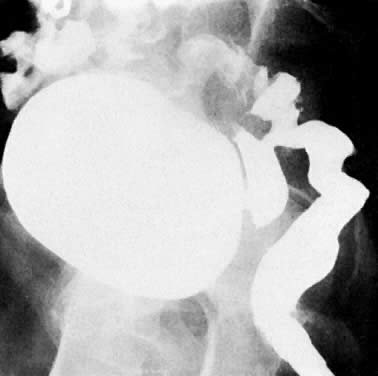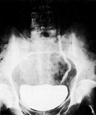 Methods of Spread The predominant method of local spread from cervical carcinoma is by direct extension to the distal ends of the ureters and the bladder base. Encasement of the ureters by metastases to the retroperitoneal and common iliac lymph nodes is also a common path of spread to the urinary system. Hydronephrosis along with deterioration of renal function consequently develops. Griffin and co-workers108 found that 7.3% of their patients with carcinoma of the cervix demonstrated incomplete ureteral obstruction causing hydronephrosis or complete ureteral obstruction with nonvisualization of the kidney on EU. Van Nagell and co-workers109 reported that 2.8% of patients with stage I disease had obstructive uropathy demonstrated on EU. The incidence of ureteral obstruction was 32% in patients with stage III disease. Patients with ureteral obstruction also have an unfavorable prognosis, with a 5-year survival of 18%. With anterior extension of carcinoma of the cervix or corpus, a bladder fistula can occur, caused by neoplastic invasion of the supporting tissues and shrinking of the tumor after treatment. Radiologic Examinations and Findings Previously, EU and retrograde pyelography have been the principal radiologic methods for examination of the urinary tract. As the tumor encases the ureter, a narrowed segment occurs (Fig. 36). The renal pelvis and calices and the ureter proximal to the involved area dilate (Fig. 37). With further involvement, the kidney ceases to function. Patients who have had a radical hysterectomy frequently have proximal ureterectasis to just below the pelvic brim. This radiologic finding lasts 6 to 12 months, and findings then gradually return to normal. The normal or narrowed distal ureters also are pulled medially secondary to the surgical procedure.