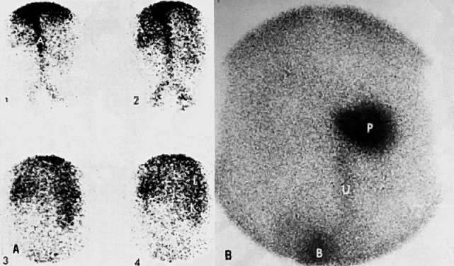 Currently ultrasound, CT, and MRI have replaced EU for the detection of urinary tract obstruction. Both CT and MRI can accurately demonstrate local tumor spread. CT has been shown to be superior to EU in the evaluation of the urinary system.24,110,111 Although the specificity of EU ranges from 79% to 97%, its sensitivity ranges from 7% to 33% in depicting the spread of malignant diseases.110 EU demonstrates the course and caliber of the ureters, but it is inaccurate in diagnosing nonobstructive extension of malignancy to the ureter. The superiority of CT is more noticeable in stage IIB cervical cancer and at more advanced stages.24 CT not only can diagnose ureteral obstruction, but also can detect its level and cause. In one study, ureteral involvement without hydronephrosis was detected in 21% of cases (see Fig. 11).9 CT can also demonstrate involvement of unopacified obstructed ureters (Fig. 38A and Fig. 38B). Ultrasound is the preferred method of screening for and assessing the degree of hydronephrosis (see Fig. 6C). It has an accuracy of 97%, a sensitivity of 90%, and a specificity of 98%.112 Although it is not as accurate as CT, it can sometimes show the level and cause of obstruction (see Fig. 6B). Renal and perirenal abnormalities can be accurately evaluated by ultrasound, CT, and MRI. 99mTc - diethylenetriamine-pentaacetic acid (DTPA) radionuclide imaging has also been used to complement other studies in the evaluation of renal perfusion, residual function, and presence and degree of urinary obstruction (Fig. 39).113 Air in the bladder seen on plain film examination (Fig. 40A) may indicate a vesicovaginal fistula. Placing a tampon in the vagina before a cystogram is an effective method of demonstrating this fistula (Fig. 40B). The contrast medium instilled into the bladder fills the tampon as it flows through the fistula, and an oblique projection shows the opacified vaginal tampon. Contrast medium absorbed by the tampon can also be seen after drainage of the bladder. A colon examination can demonstrate a vesicovaginorectal fistula. Barium introduced into the rectum fills the vaginal vault and urinary bladder (Fig. 41). MRI and ultrasound are more accurate in assessing bladder wall infiltration by tumor (see Fig. 17C, Fig. 18, Fig. 20, and Fig. 24A). |