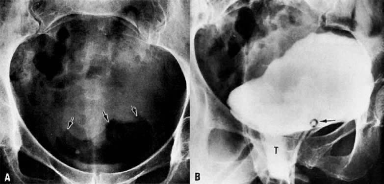 Pulmonary Complications Chemotherapeutic agents used in the treatment of gynecologic malignancies may cause diffuse interstitial or reticulonodular pulmonary infiltrates that could mimic lymphangitic metastases. Bleomycin, methotrexate, and cyclophosphamide are three chemotherapeutic agents used in gynecologic cancer that cause this complication. The chest radiographic examination is helpful for the detection of lymphangitic spread. Lung biopsy may occasionally be necessary to differentiate metastatic tumor from iatrogenic disease.147 Urinary Complications UTERER. Slater and Fletcher148 reviewed 1749 patients treated with radiation therapy for carcinoma of the cervix. A total of 194 patients had strictures before treatment and were therefore excluded, yielding 1555 patients. Of 1416 patients with radiographically proven normal ureters and 139 without initial urograms but presumed normal, 134 had ureteral obstructions after therapy, of whom 108 had recurrent disease. Of the 26 without evidence of recurrent disease, 16 had surgical procedures after the irradiation that may have contributed to fibrosis around the ureter, 5 had fibrosis at the site of the tumor, and 5 had narrowing attributable solely to radiation. This group of five patients in whom ureteral narrowing developed constituted 0.3% of the total 1555 patients. However, transient ureterectasis caused by ureteral edema sometimes can be seen 3 weeks after radiation therapy. Radiographically, these acute changes appear as areas of ureteral narrowing and medial deviation of the ureters.149 BLADDER. Acute radiation cystitis complicating pelvic irradiation or chemotherapy can occur after 4 months. Loss of epithelium and ulceration are chronic changes that may occur 1 to 20 years after irradiation. On cystography, the chronically damaged bladder appears small, with a thick wall. Ureteral reflux and elevation of the bladder floor may also be present. With severe ulceration, the bladder wall may rupture and develop a fistula to adjacent organs (see Fig. 41). Rarely, the damaged bladder wall contains dystrophic calcification. The use of cyclophosphamide can also result in hemorrhagic cystitis. The bleeding can be life threatening, and blood clots frequently fill the bladder (Fig. 58).150