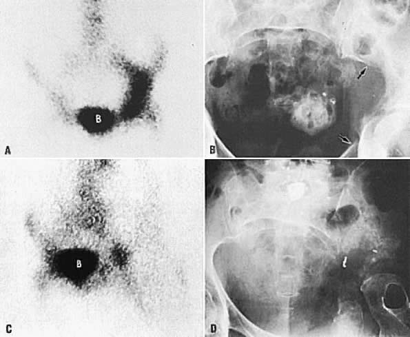 *Total excluding vertebrae. (Data from †Henriksen E: The lymphatic spread of carcinoma of the cervix and of the body of the uterus. Am J Obstet Gynecol 58:924, 1949; and ‡Bergman F: Carcinoma of the ovary. Acta Obstet Gynecol Scand 45:211, 1966) Radiologic Examinations and Findings Bone scintigraphy and radiographic skeletal bone survey are the standard imaging procedures for skeletal metastases. Neither imaging modality is indicated in asymptomatic patients. In patients with bone pain, bone scintigraphy should be obtained first in order to identify areas of metastases. Bone radiography is obtained for correlation with positive bone scans. Currently, bone scintigraphy is more sensitive than skeletal survey for detecting early skeletal metastasis.120 The abnormal bone is usually visualized as areas of increased radiotracer activity (Fig. 47A and Fig. 47B); however, in a few cases, the abnormality is imaged as an area of decreased activity (Fig. 47C and Fig. 47D).121 The radiotracer uptake depends on the amount of new osteoid tissue formation. Although CT and MRI are not primary screening techniques for bone metastases, they can detect tumor spread to bone in the pelvis or spine when used for staging of gynecologic malignancies (Fig. 48). | ||||||||||||||||||||||||||||||||||||||||||||||||||||||||||||||||||||||||||||||||||||||||||||||||||||