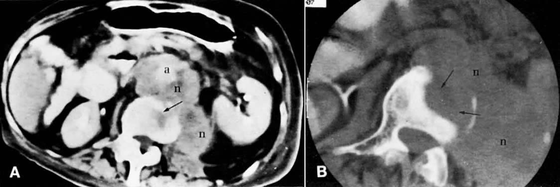 For whole-abdomen irradiation in ovarian cancer, plain anteroposterior radiographs are obtained to plan the radiation fields. Intravenously administered contrast material is used to delineate the kidneys for the purpose of shielding in order to reduce the radiation dose to these organs.140 CT is also frequently used to localize the kidneys, spinal cord, and cauda equina in order to limit the radiation dose to these radiosensitive structures. Before intraperitoneal instillation of radioactive phosphorus (32P) for the treatment of ovarian cancer, plain anteroposterior and lateral abdominal radiographs are obtained after intraperitoneal instillation of water-soluble contrast media to demonstrate adequate intra-abdominal distribution. Alternatively, scintigraphy after instillation of 99mTc sulfur colloid is also used.141 |