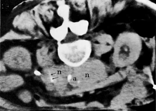 Methods of Spread Cancer of the female genital organs frequently spreads via lymphatics to the pelvic (obturator and internal, external, and common iliac) and retroperitoneal lymph nodes. Radiologic Examinations and Findings Both CT and MRI have replaced lymphography in detecting tumor spread to the lymphatic system. CT has a reported accuracy of 83% and a specificity of 86% in detecting metastases to the para-aortic lymph nodes.122 Although CT is useful in detecting small lymph nodes within the pelvis, it is slightly less accurate (70% to 80%) in detecting metastases to pelvic lymph nodes compared to para-aortic lymph nodes, because of the sparsity of fat around the former.25 The diagnosis of lymph node metastases by CT depends predominantly on the increase in their size, but occasionally there is also a change in density (see Fig. 45B and Fig. 45C). Normal lymph nodes measure less than 1 cm in diameter. An isolated para-aortic or iliac lymph node measuring 1 to 1.5 cm should be considered suspicious (see Fig. 45C), and a clustering of small lymph nodes should be considered abnormal (see Fig. 38C). Lymph nodes larger than 1.5 cm in diameter also should be considered abnormal (see Fig. 45B).123 Metastatic lymphadenopathy is occasionally visualized as a conglomerate group of contiguous enlarged lymph nodes similar in size to the aorta or inferior vena cava, or as a large, homogeneous mass (see Fig. 48A).124 A false-negative diagnosis by CT is caused by the technique's inability to diagnose metastases in normal-sized lymph nodes. Because metastases from cervical carcinoma often replace part of a lymph node without enlarging it, the reported false-negative rate has been as high as 40%.25 A false-positive diagnosis results from the inability of CT to differentiate enlarged nodes caused by hyperplasia from those caused by metastases. CT-guided percutaneous fine-needle aspiration biopsy of the enlarged lymph nodes may be required (Fig. 49). Extension of tumor into lymph node groups not opacified by lymphography (e.g., mesenteric lymph nodes) can also be detected by CT, and biopsy specimens of these nodes can be taken during CT scanning.