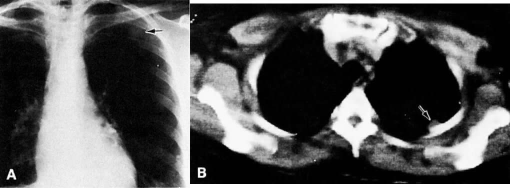Methods of Spread Metastatic spread to the chest from gynecologic malignancies is uncommon and occurs predominantly by the hematogenous route. Lymphatic spread is rare.133,134,135 At autopsy, metastatic pulmonary lesions were found in 27.9% of patients with cervical carcinoma,117 30.2% with endometrial carcinoma,117 and 37.2% with ovarian carcinoma (see Table 4).118 In pretreatment chest radiographs, however, the incidence of chest metastases was found to be less than 1% in two separate studies.108,136 Ovarian carcinoma can spread via the peritoneal cavity through the diaphragm into the pleural cavity, causing malignant pleural deposits and effusions. Radiologic Examinations and Findings The posteroanterior and lateral chest radiographic examination is a standard procedure in staging gynecologic malignancies. Decubitus views are performed to confirm the presence of free pleural effusion. The side with the suspected effusion is placed in the dependent position; if free fluid is present, it will layer along the lateral chest wall. Chest CT is a more sensitive and accurate test that can be used to confirm the presence of lesions and to differentiate benign from malignant ones. CT better visualizes lesions in the apices of the lungs, costophrenic sinuses, cardiophrenic angles, mediastinum, and supradiaphragmatic areas. In some cases, pleural-based lesions (Fig. 53) and loss of rib detail are also better demonstrated by CT.137 CT can identify diffuse calcification by assigning a higher number to the nodule. Unfortunately, CT cannot differentiate benign from malignant nodules when they are not calcified. Recent advances in CT technology, including spiral CT, have been used to reconstruct three-dimensional images of the chest and detect tumor spread to the pleura. In addition, spiral CT probably has a higher rate of detection of metastatic nodules than conventional CT, because of the lack of respiratory motion artifacts. CT-guided fine-needle percutaneous aspiration biopsy is used to differentiate benign from malignant chest nodules with a high degree of accuracy.
