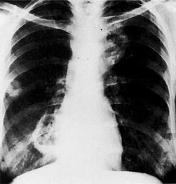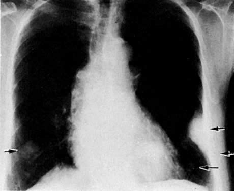 Hematogenous metastases have a nodular appearance and usually occur in the lower lung fields because of their preferential blood flow in the erect posture (Fig. 54 and Fig. 55). Occasionally, metastatic lesions from squamous cell carcinoma cavitate (Fig. 56). Solitary lesions in the upper lobes are unlikely to be metastases.138 The presence of central nodular, concentric, or diffuse popcorn calcifications in a nodule denotes benignity.