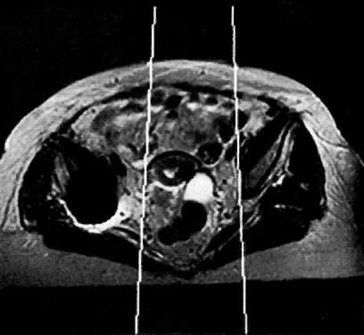 Radiologic procedures play a significant role not only in diagnosing gynecologic malignancies, but also in planning their treatment. In cervical and endometrial cancer, plain radiographs, ultrasound, and CT are commonly used for planning radiation therapy. The delineation of radiation treatment fields is generally performed under fluoroscopic guidance. Radiopaque stainless steel markers are placed into the cervix, and rectal contrast material, with or without a small-bowel follow-through study, is used to identify the cervix and radiosensitive normal structures, such as the small- and large-bowel loops that may be partially excluded from the radiation field.139 With the use of bipedal lymphangiograms, radiation fields to cover the pelvic and para-aortic lymph nodes can be individually designed based on the involved nodal areas.139 More recently, CT examinations have been used to delineate soft tissues of the pelvis and abdomen for radiation treatment planning. In cervical and endometrial cancer, intraoperative ultrasound is a valuable tool in guiding the placement of an intrauterine tandem for intracavitary irradiation. Dilation of the tumor-involved cervix or uterus is frequently difficult because of anatomic distortion by the tumor, and the cervical os is often difficult to identify. Intraoperative ultrasound can provide information on the position of the uterus and the endocervical canal, thus helping to avoid uterine perforation. Plain orthogonal isocentric radiographs with rectal and bladder contrast material are used in radioactive implants for the purpose of radiation-dose computations. More recently, MRI was found to provide better depiction of tumor volume and better delineation of extent of tumor involvement compared to physical or CT examinations.31 The information provided by MRI was found to be helpful in the placement of radiation ports, especially when small radiation boosts were used (Fig. 57).