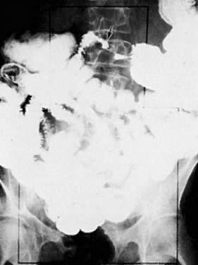 Bowel Complications Radiation damage of the bowel occurs most commonly in the terminal ileum, sigmoid colon, and rectum. The rectosigmoid tolerates higher doses of radiation than the small bowel. With external-beam radiation doses of 6500 cGy to the rectosigmoid, the incidence of severe proctitis is 2% and the incidence of severe rectal strictures is 0.5%.151 The incidence of injury (perforation, obstruction, and fibrosis) to the small bowel or gastric mucosa is 1% to 5% with radiation doses of 4500 to 5000 cGy. The risk of injury also depends on the volume of small bowel irradiated and the energy of the megavoltage beam. Previous abdominal surgery, pelvic inflammatory disease, adhesions, and tumors that cause fixation of the bowel are predisposing factors to radiation injury. Certain diseases, such as hypertension, diabetes mellitus, and collagen vascular disease, cause arterial circulatory problems and obliterative endarteritis, which may also increase the likelihood of radiation injury. Schmitz and associates152 reviewed 1200 patients treated with external irradiation for either cervical carcinoma or endometrial carcinoma and found 37 patients with radiation injury to the bowel: 14 to the terminal ileum, 3 to the sigmoid colon, and 20 to the rectum. Of the 37 patients, 29 had cervical carcinoma and 8 had endometrial carcinoma. Edema, ulceration of the mucosa, and damage to the vasculoconnective tissue of the submucosa are the principal forms of bowel injury. When healing occurs, atrophy, cicatrization, and stenosis of the bowel result from obliterative endarteritis. The radiographic appearance of radiation injury to the bowel is similar to that of ischemia. Involved areas are rigid, and the valvulae conniventes are straightened and thickened (Fig. 59); the usual pattern of the ileum, therefore, becomes irregular and pointed. “Thumbprinting” and nodular filling defects may also be seen, owing to focal areas of edema. The sequelae of radiation injury to the small bowel are obstruction resulting from the narrowing of the bowel segments and perforation with peritonitis and fistula formation. The radiographic appearance of radiation injury must be differentiated from that of regional enteritis, lymphoma, and recurrent tumor. CT can be helpful in the differentiation. Rectal fistula formation and loss of colon haustra with smooth narrowing are some of the sequelae of radiation injury (Fig. 60). Gastric or duodenal ulcers caused by radiation therapy of the upper abdomen can occur 2 months to 6 years after treatment (Fig. 61).153 Small- and large-bowel changes can occur as much as 20 years afterward.